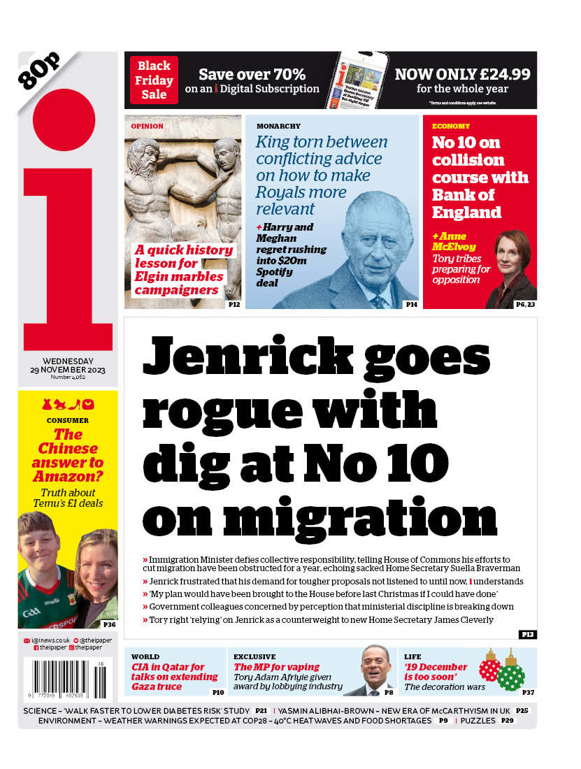 The i highlights Robert Jenrick’s struggle to reduce migration over a year.