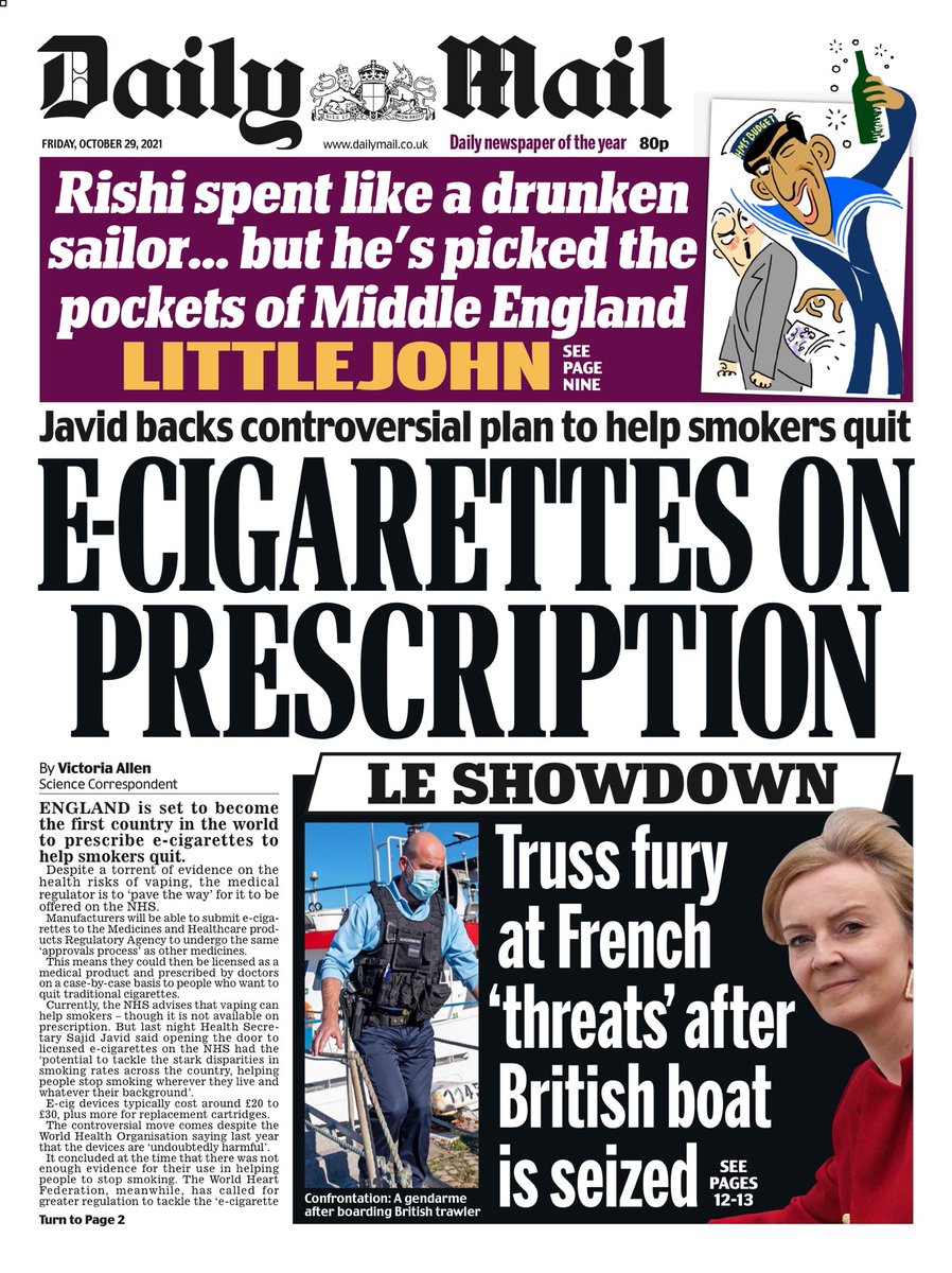 The Daily Mail splashes on plans to prescribe e-cigarettes to help smokers quit.