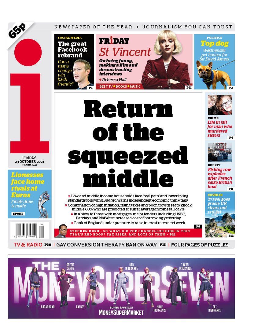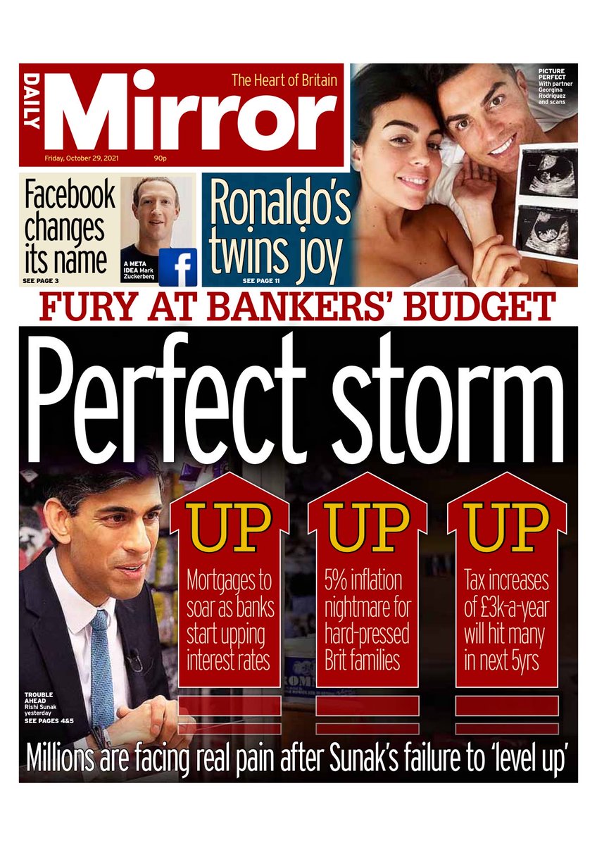 The Daily Mirror leads with fury over the budget, warning of mortgages soaring, high inflation and tax increases of more than £3,000 per year.