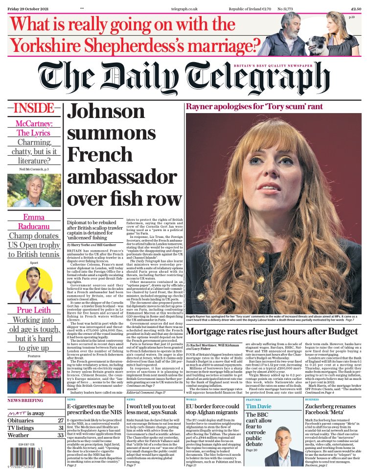 The Daily Telegraph reports on Britain summoning France’s ambassador to the UK after the French detained a British scallop trawler in a dispute over fishing licences.