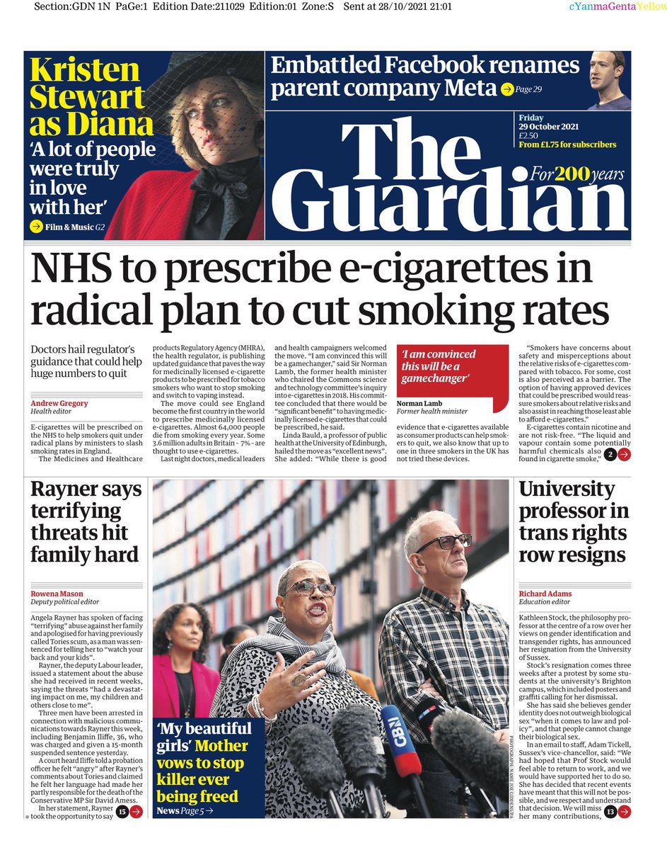 The NHS’s plan to prescribe e-cigarettes to cut smoking rates is on The Guardian’s front page.