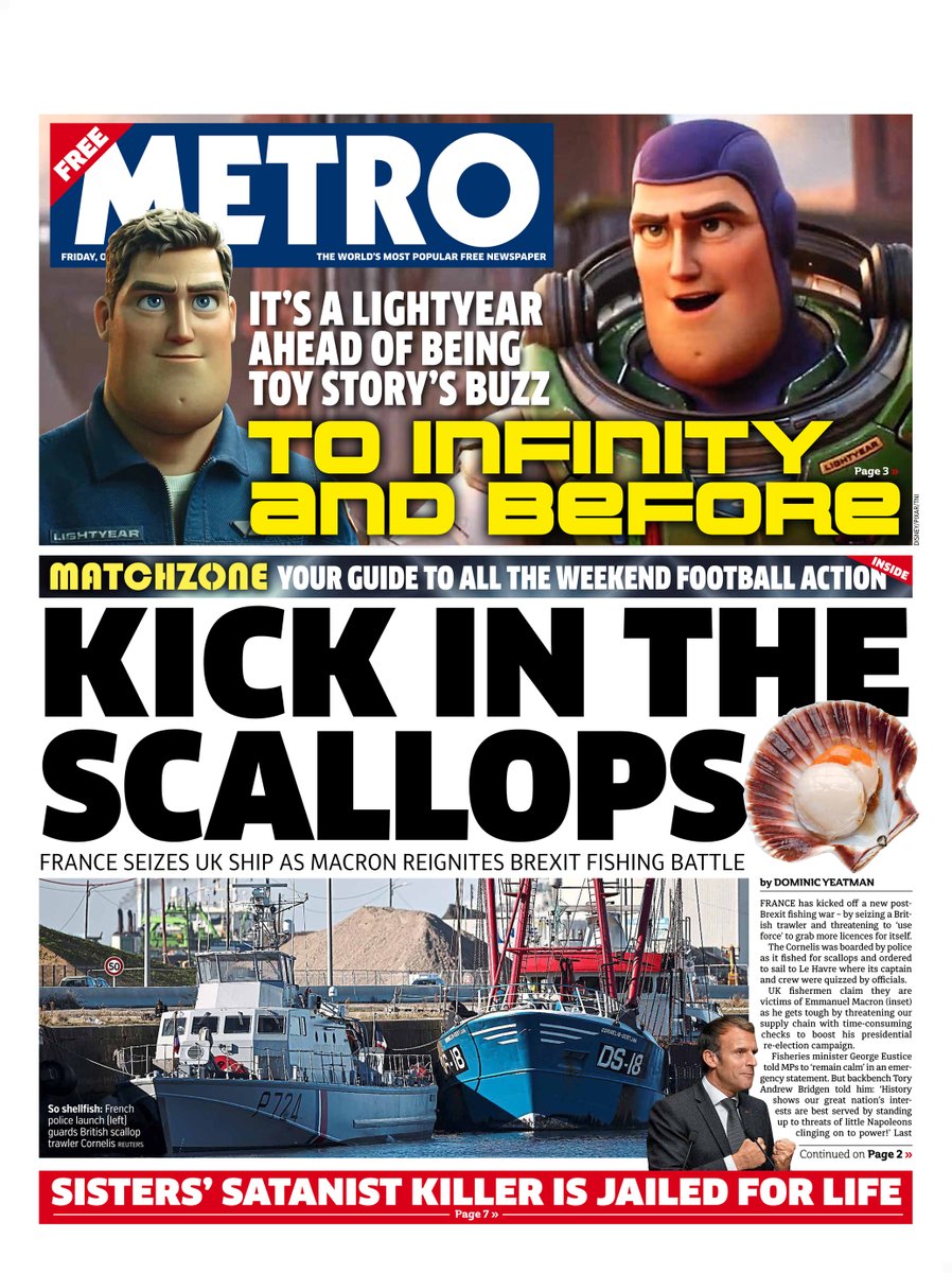 France’s seizure of a British trawler makes the front of Metro in what the paper describes as a “new post-Brexit trade war”.