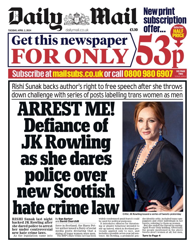 The Daily Mail reports on Rishi Sunak’s defence of JK Rowling amidst new Scottish hate crime laws.