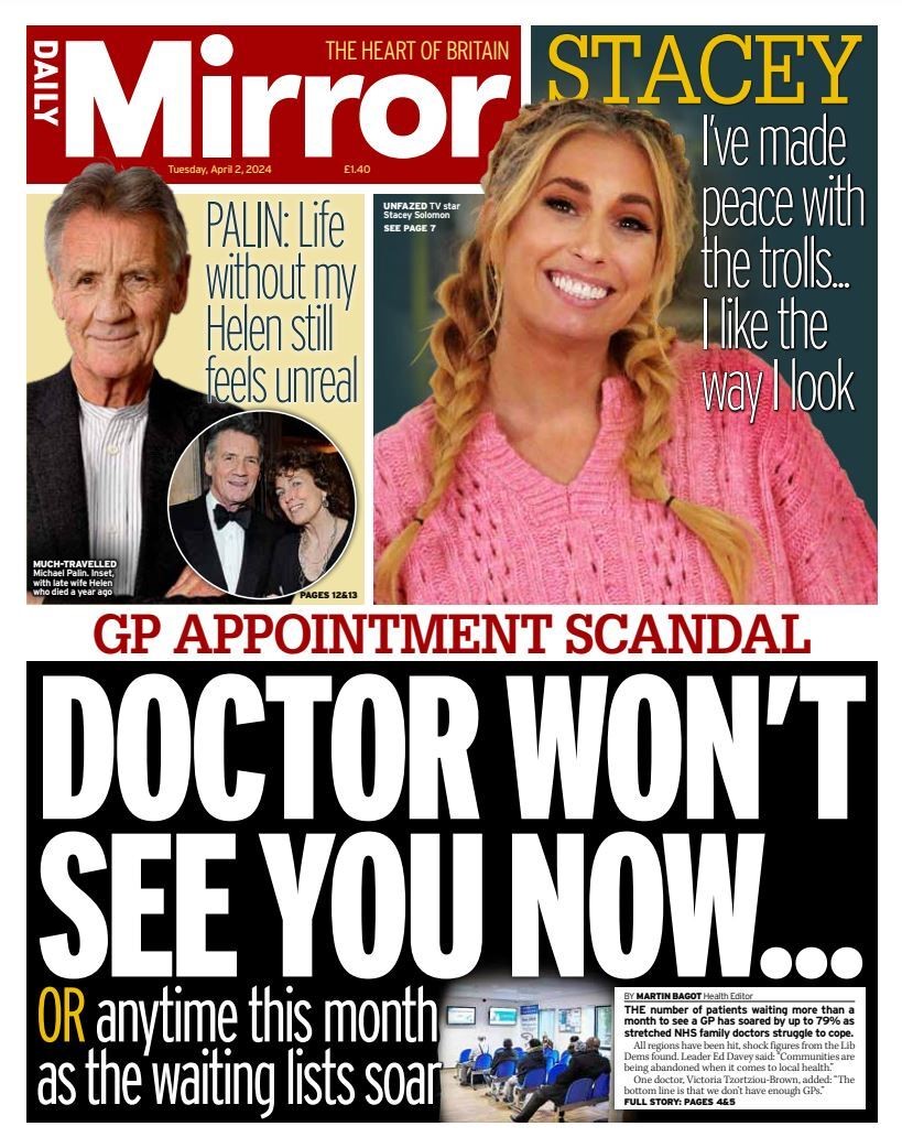 The Daily Mirror highlights a 79% surge in patients waiting over a month to see a GP due to overwhelmed NHS family doctors.