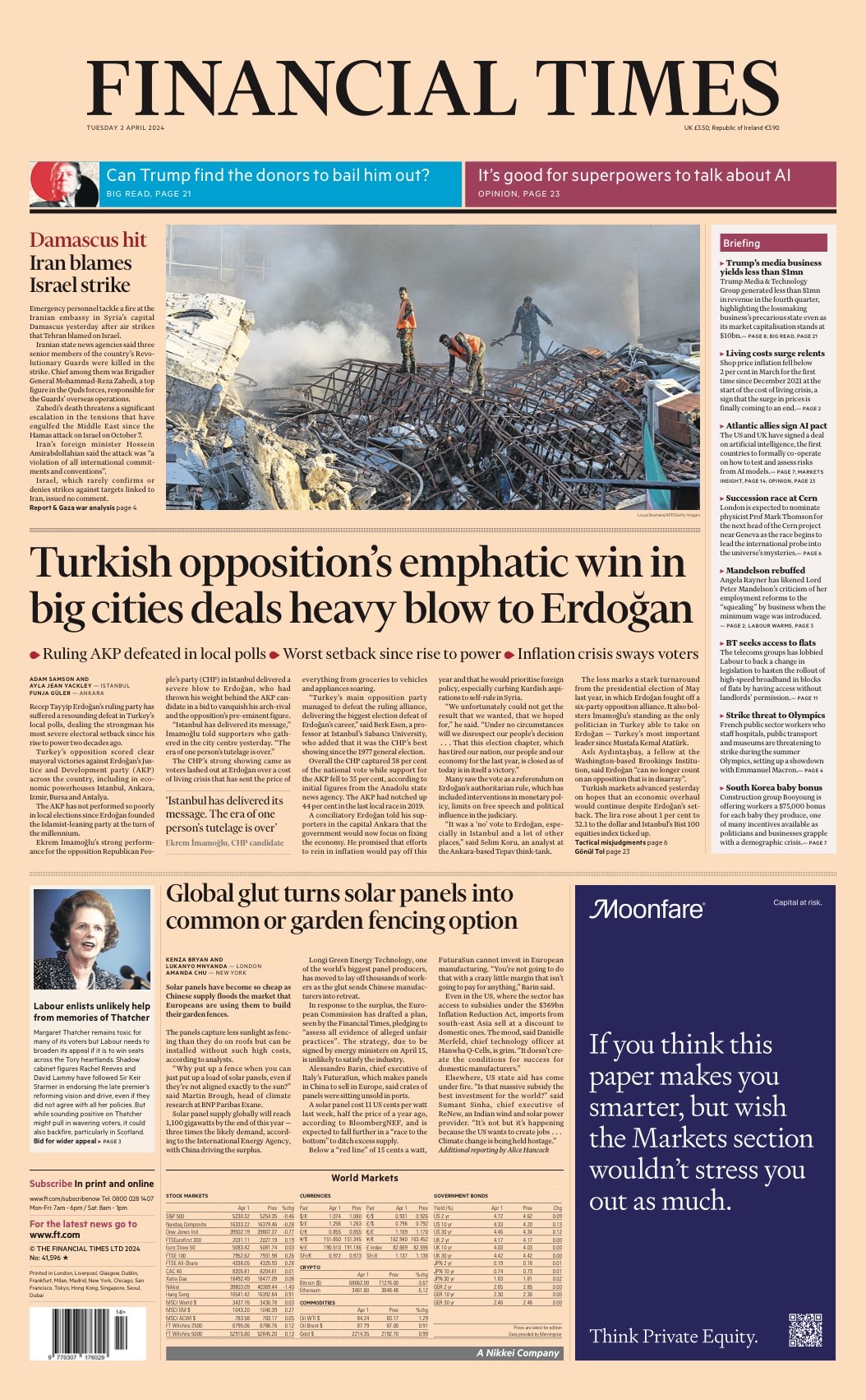 The Financial Times reports on the significant defeat of President Erdogan’s party in Turkish local elections.