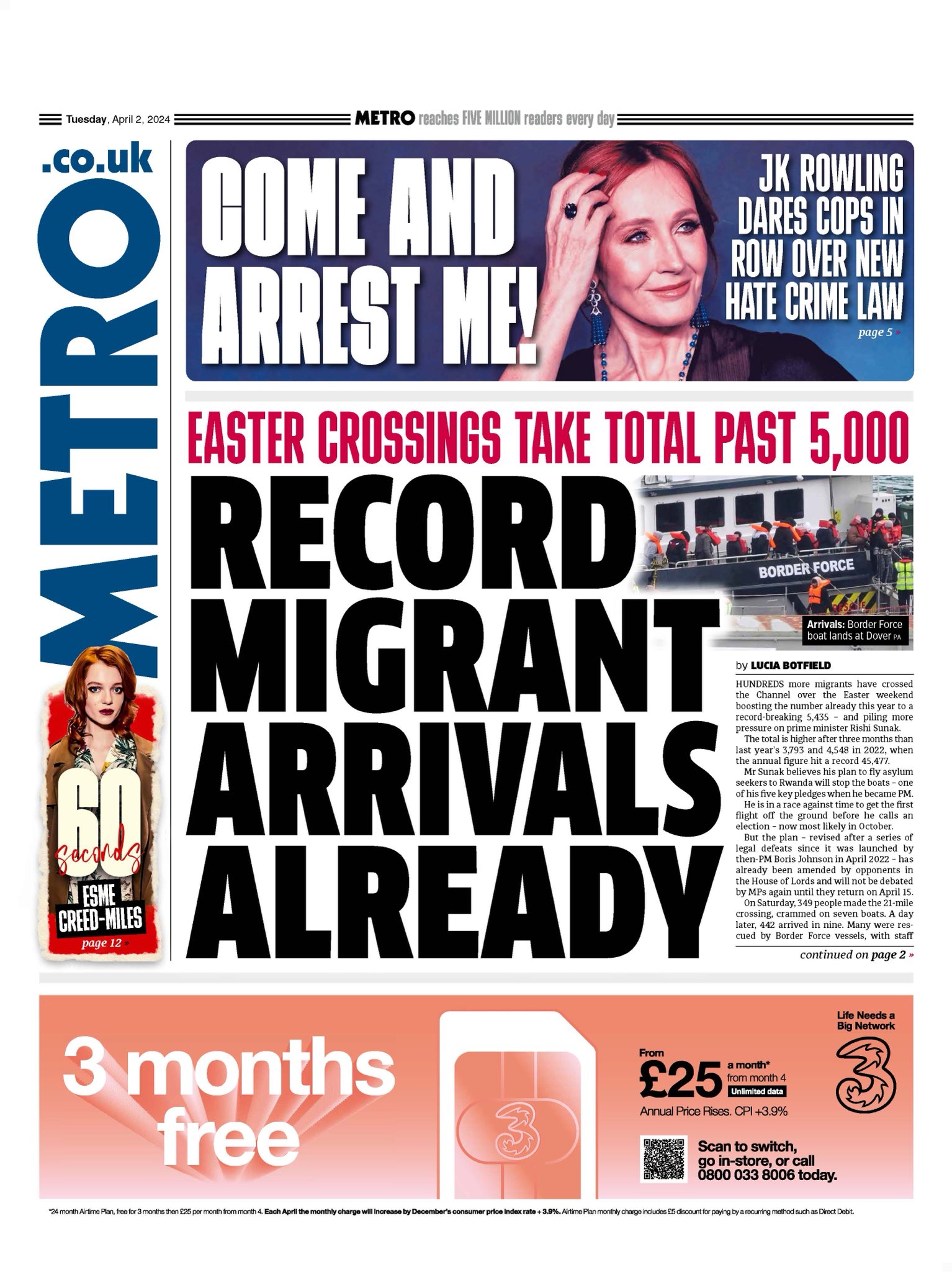 The Metro reports a surge in English Channel migrant crossings over Easter.