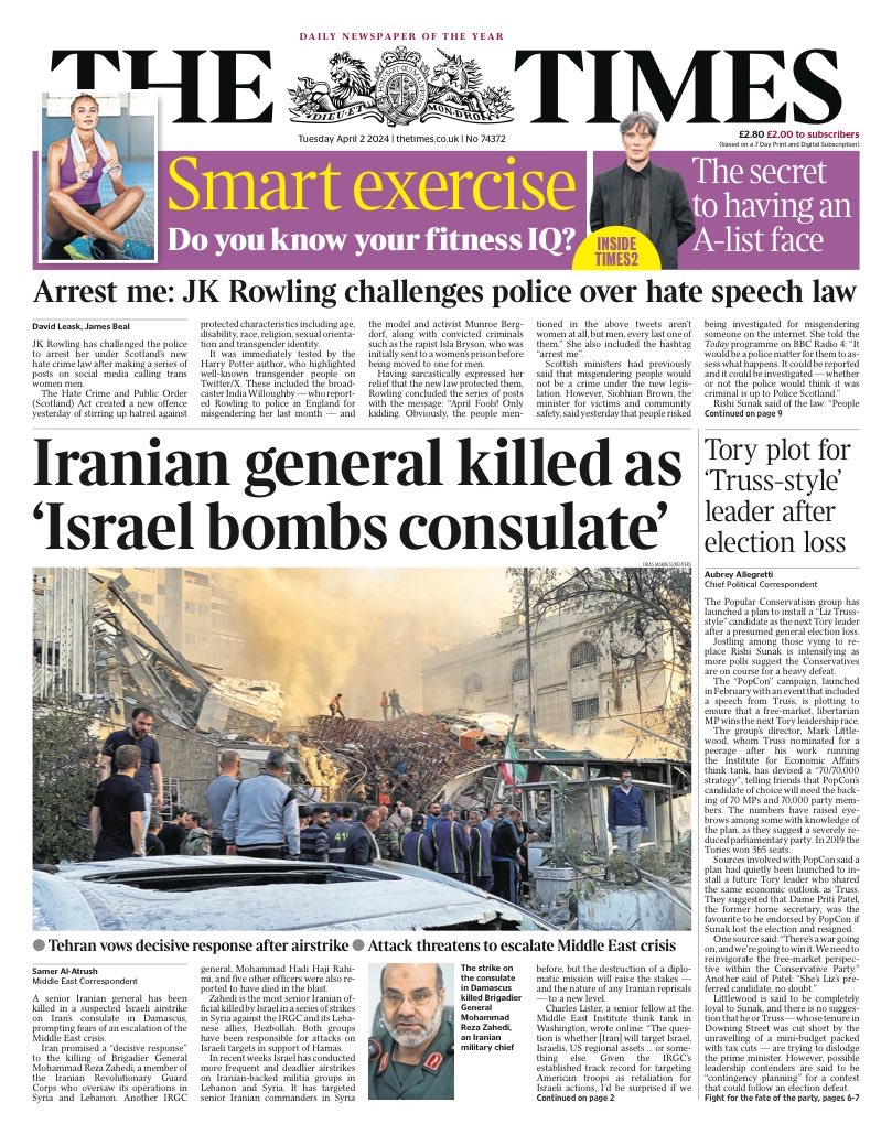 The Times reports on the killing of a top Iranian general in a suspected Israeli airstrike, escalating Middle East tensions.