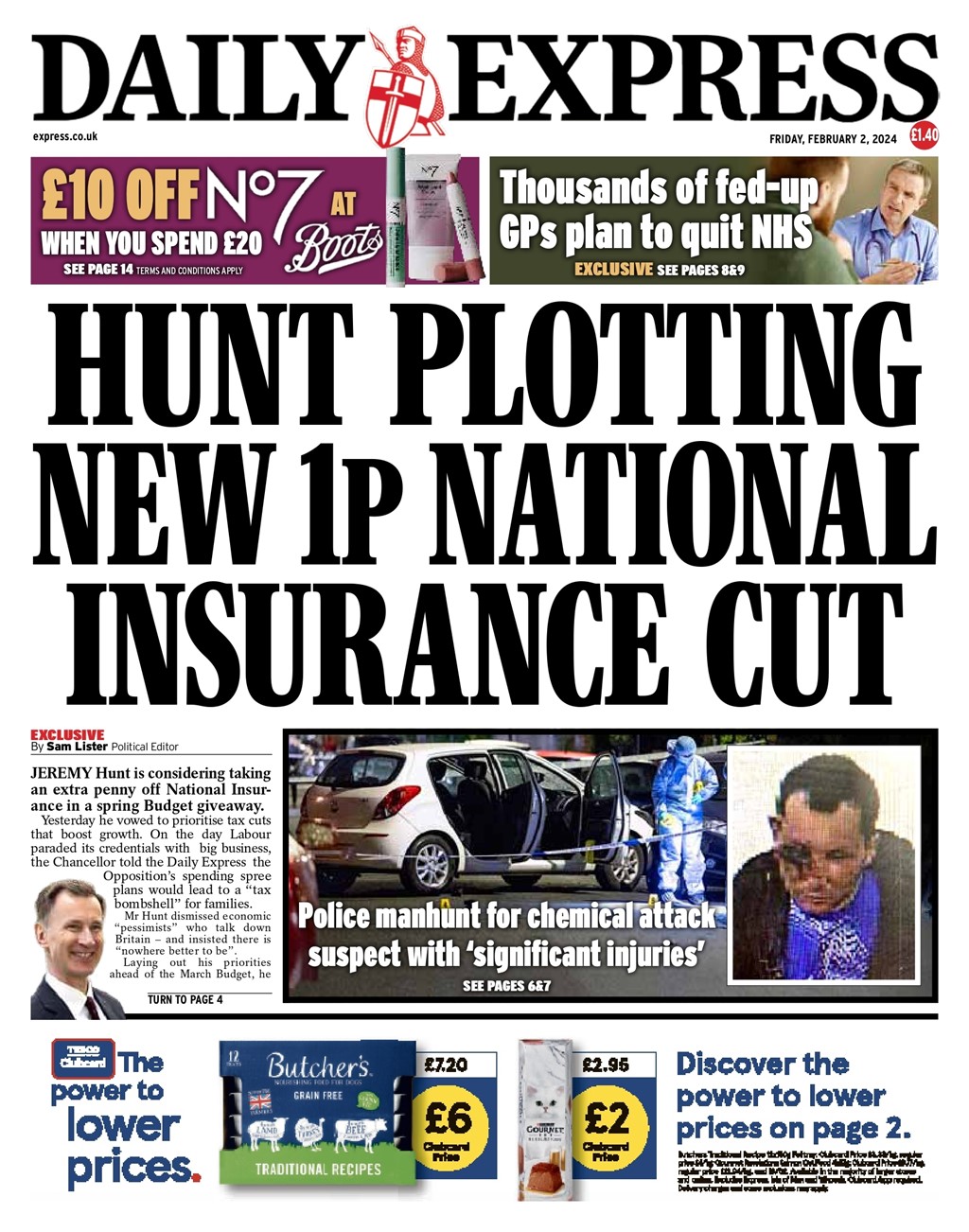 The Daily Express reports on Jeremy Hunt’s contemplation of a one penny reduction in National Insurance.