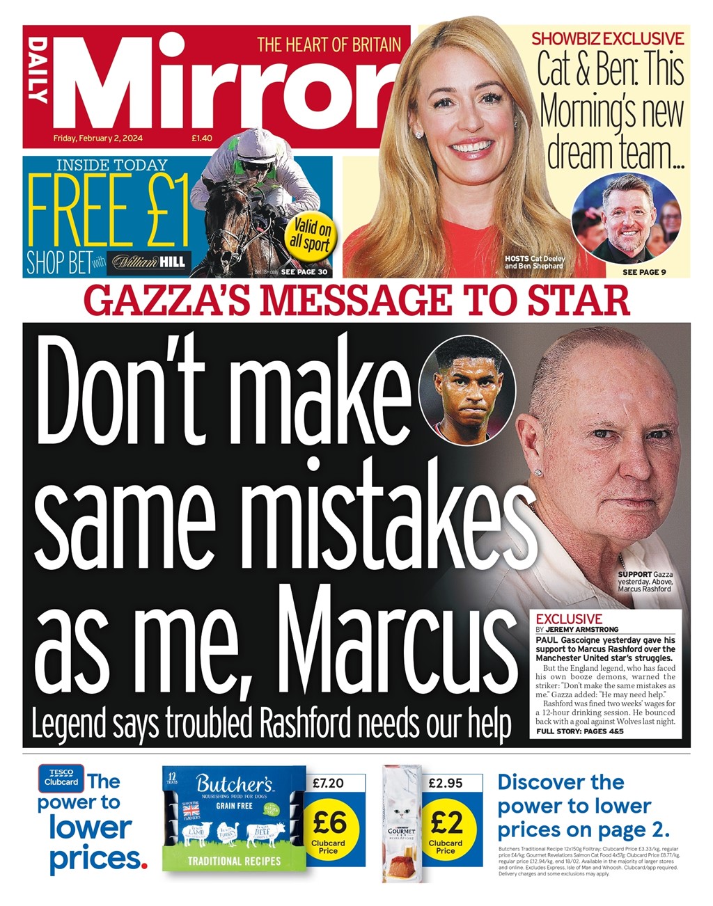 The Daily Mirror features an exclusive interview with Paul Gascoigne supporting Marcus Rashford.