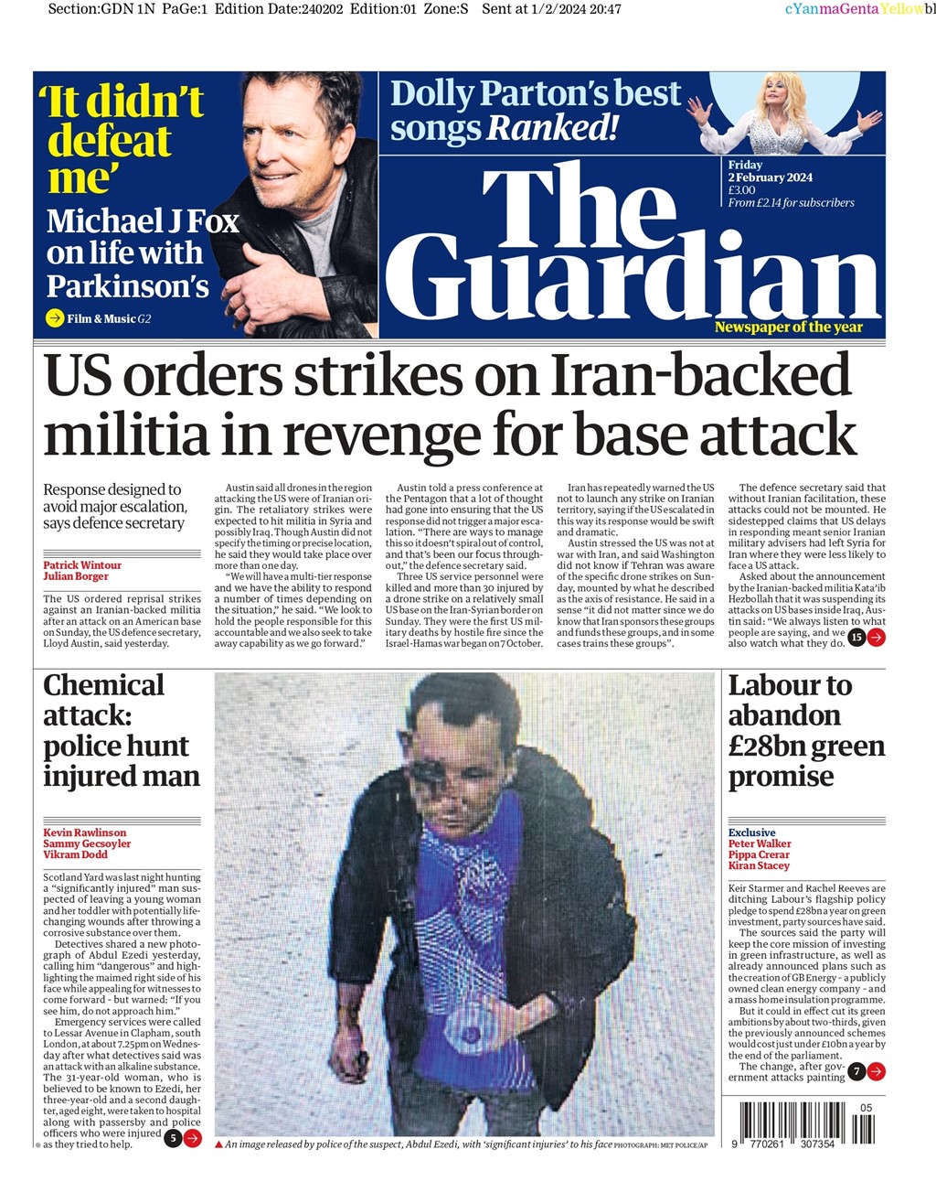 The Guardian reports on US defence secretary Lloyd Austin’s announcement of reprisal strikes against an Iranian-backed militia.