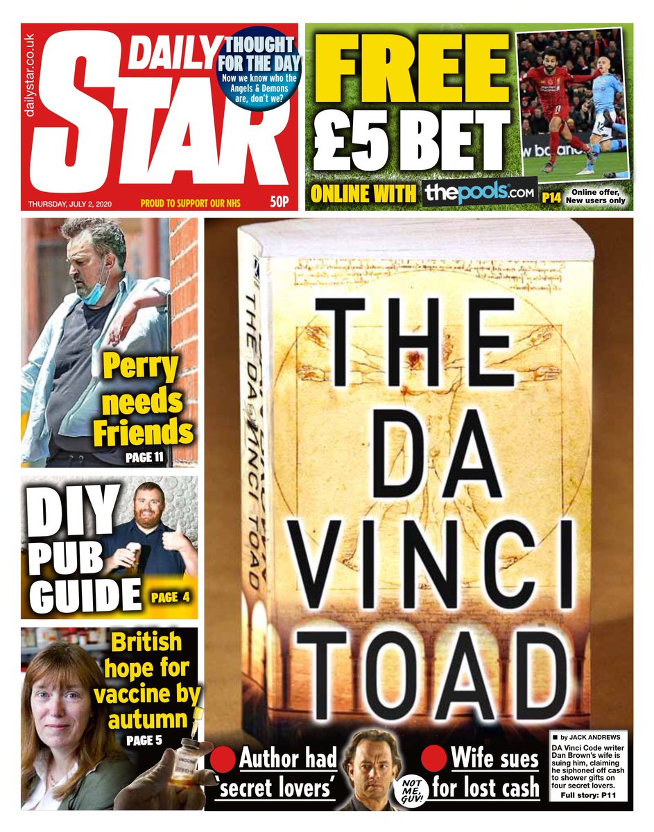 The Da Vinci Toad is the Daily Star’s headline as it reports author Dan Brown’s wife is suing him for allegedly siphoning off money to buy presents for four secret lovers.
