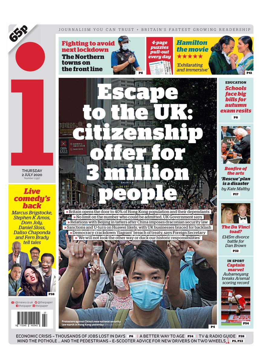 The i leads on the UK offering citizenship to nearly three million Hong Kongers after China imposed a national security law on the city.