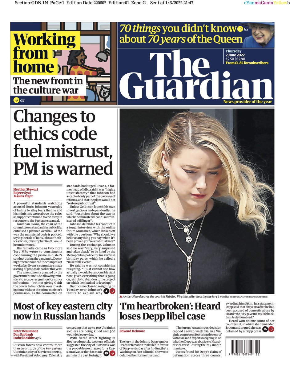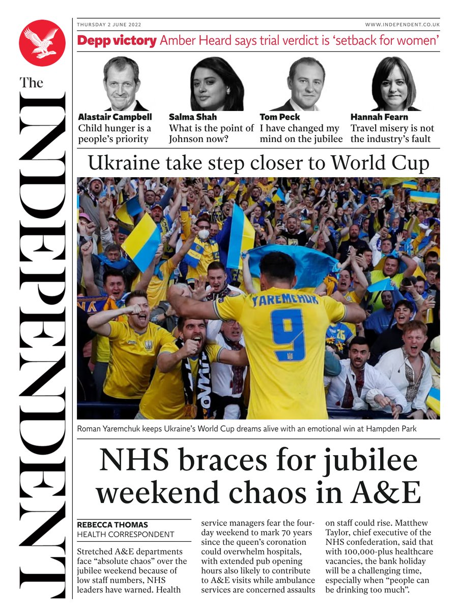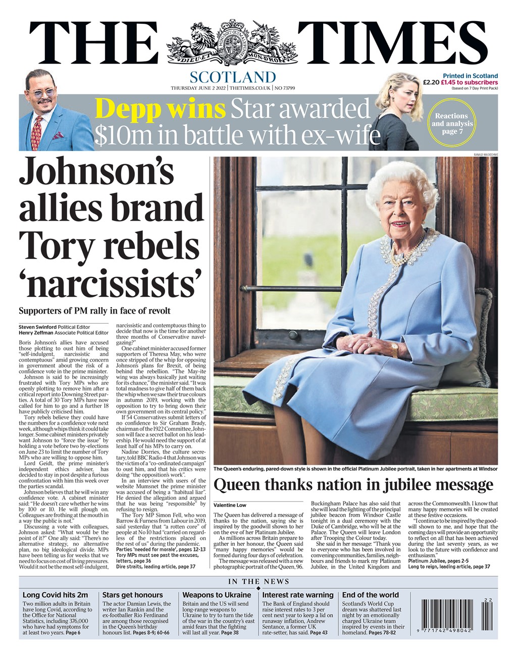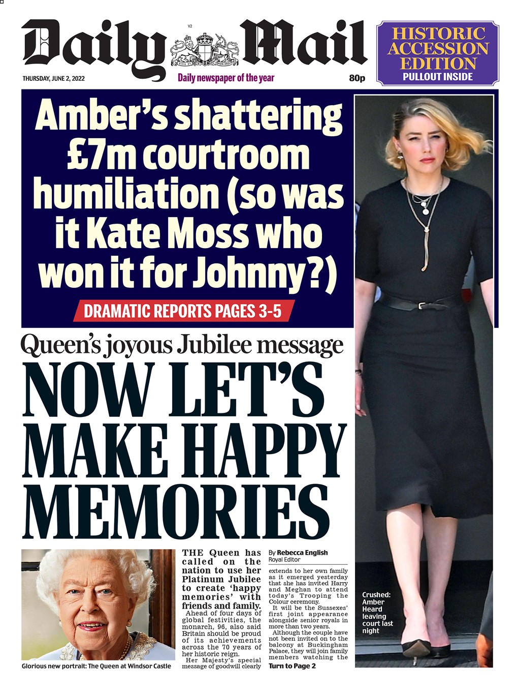 The Queen has called on the nation to create “happy memories” over the extended Jubilee weekend, the Daily Mail reports. It also features a picture of Amber Heard after her “£7m courtroom humiliation” against Johnny Depp.