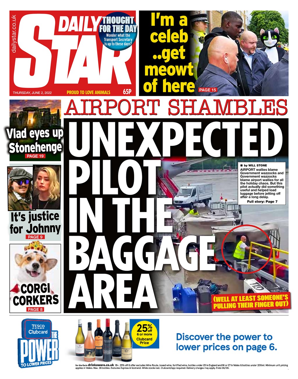 An image of a pilot helping load bags is displayed as the newspaper bemoans the UK’s “airport shambles”.