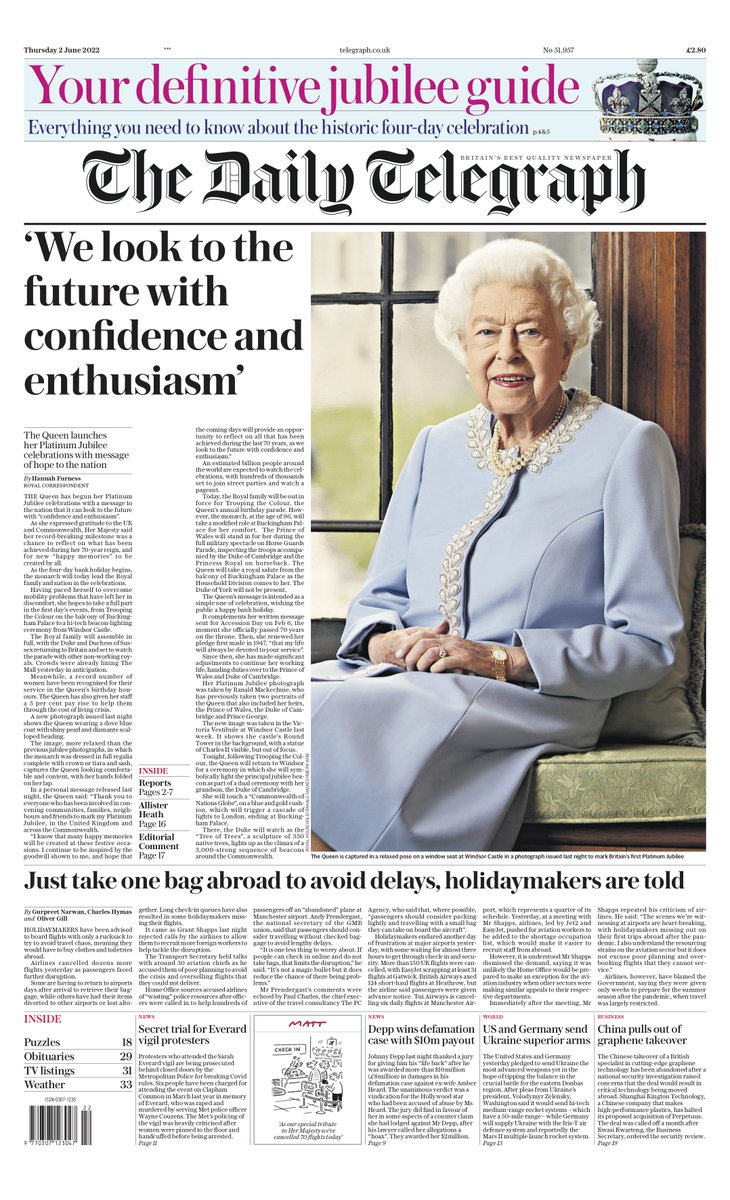 The Telegraph reports on the Queen’s remarks ahead of the Jubilee celebrations. During the next four days, the monarch said, “many happy memories will be created” and that the nation can look to the future with confidence and enthusiasm.