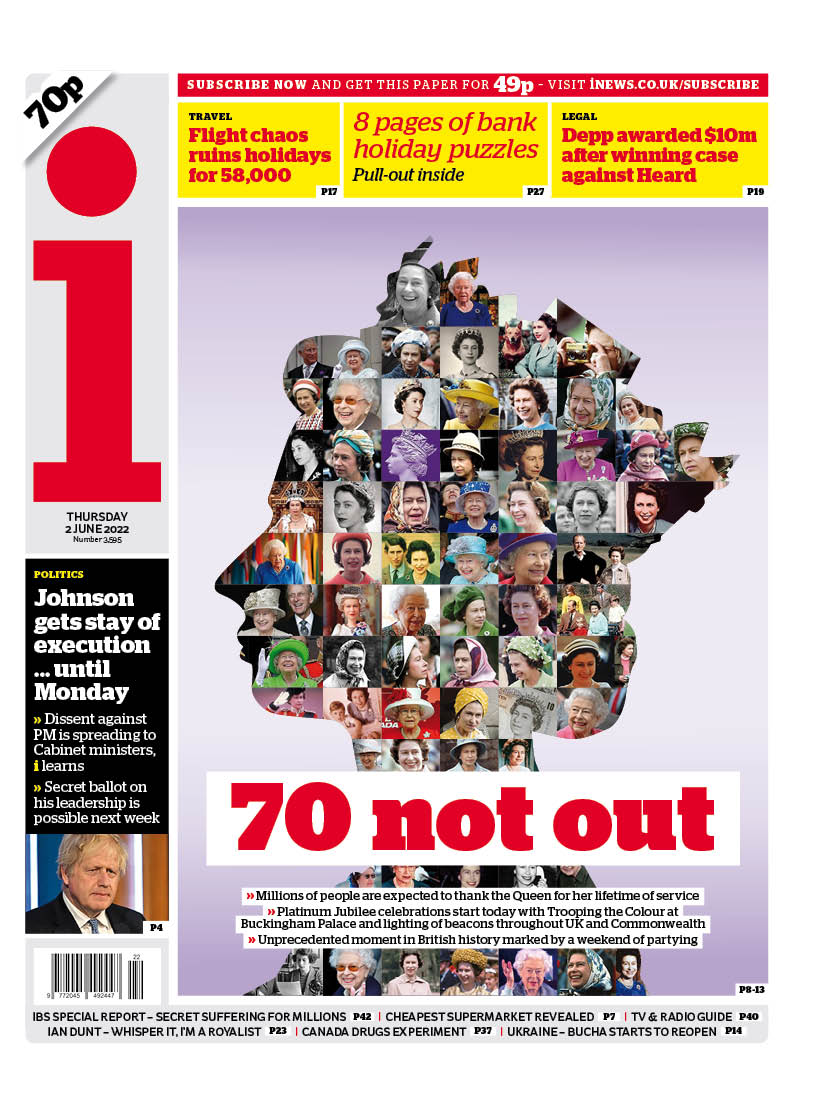 The i’s front page features a mosaic of Queen images that says the “unprecedented” Jubilee will be a “weekend of celebration”.