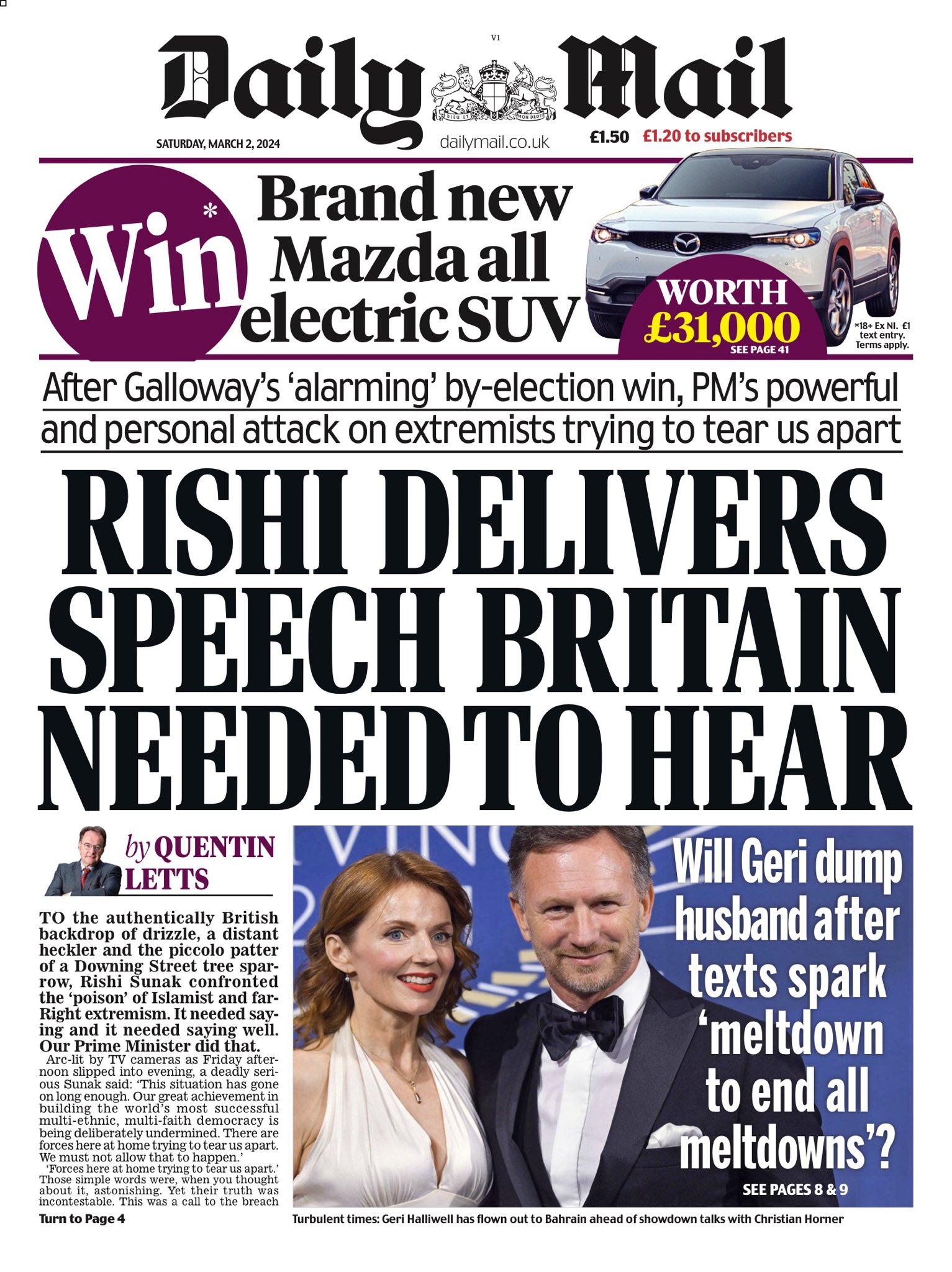 The Daily Mail highlights the significance of Rishi Sunak’s speech on extremism for Britain.