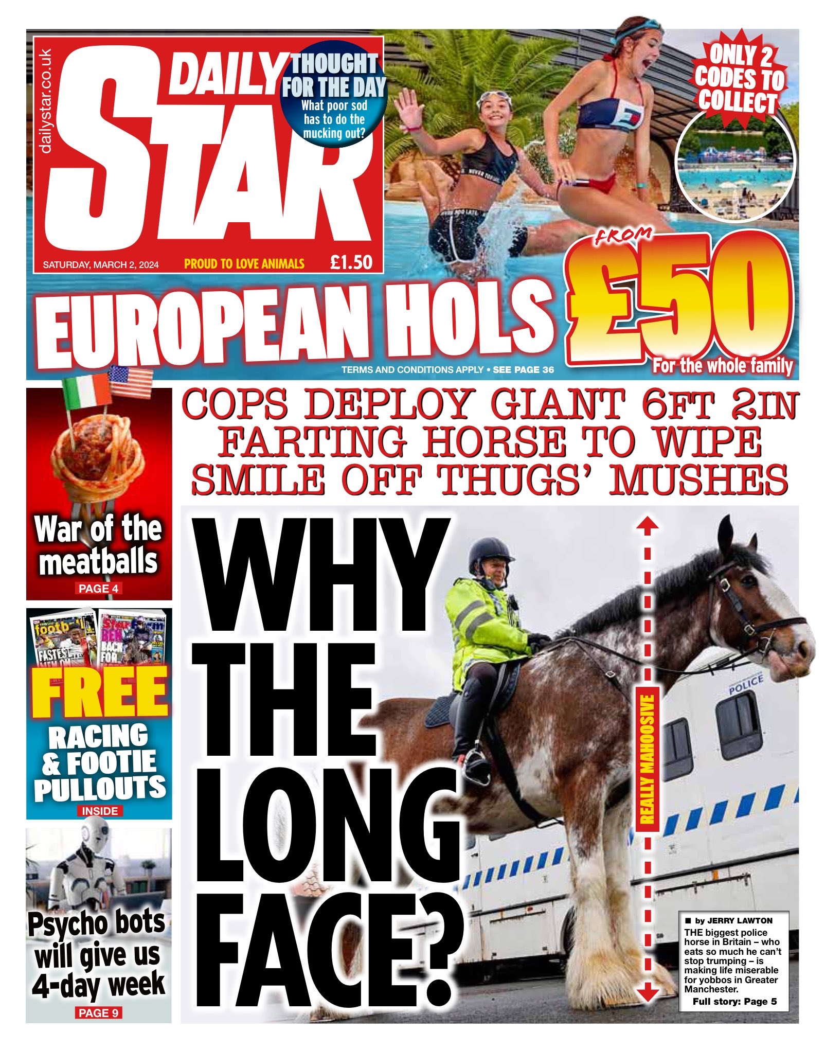 The Daily Star highlights the recruitment of a 6ft 2 horse, known for its flatulence, by Greater Manchester Police.