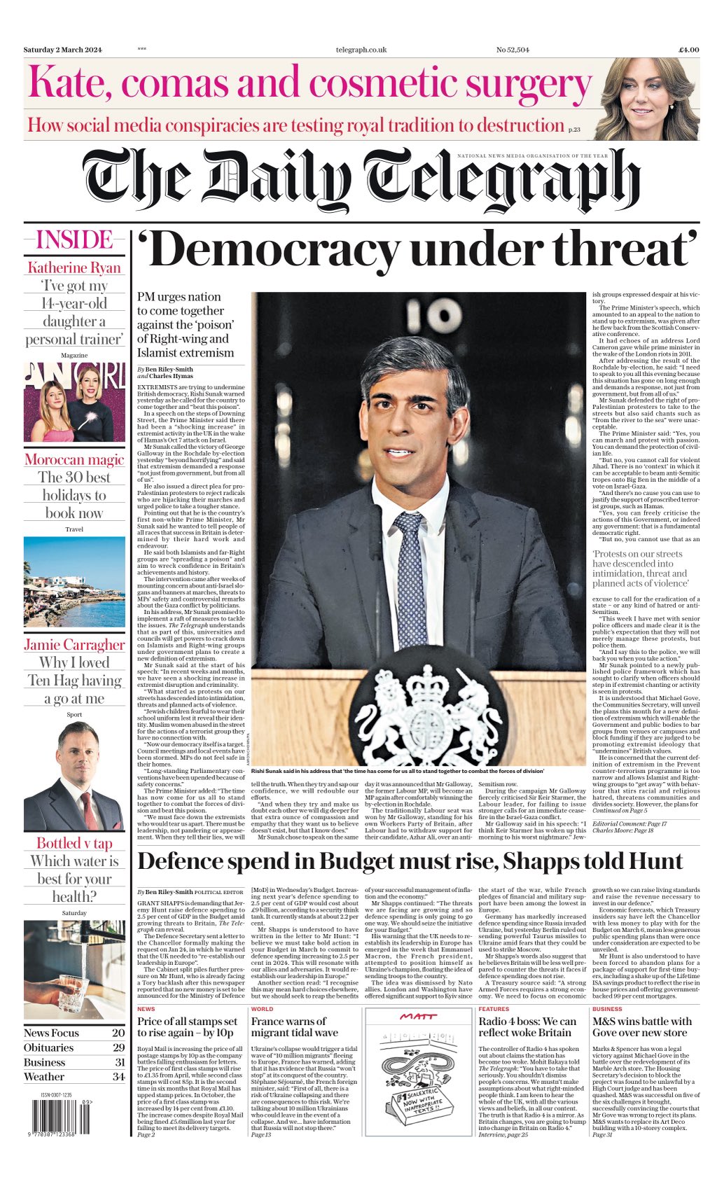 Rishi Sunak’s call for the UK to combat extremism features prominently in The Daily Telegraph.