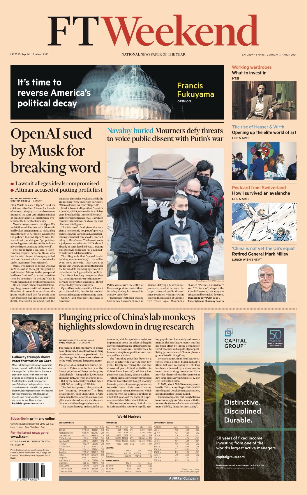 The Times covers Rishi Sunak’s reaction to George Galloway’s by-election victory in Rochdale, describing it as “beyond alarming”.