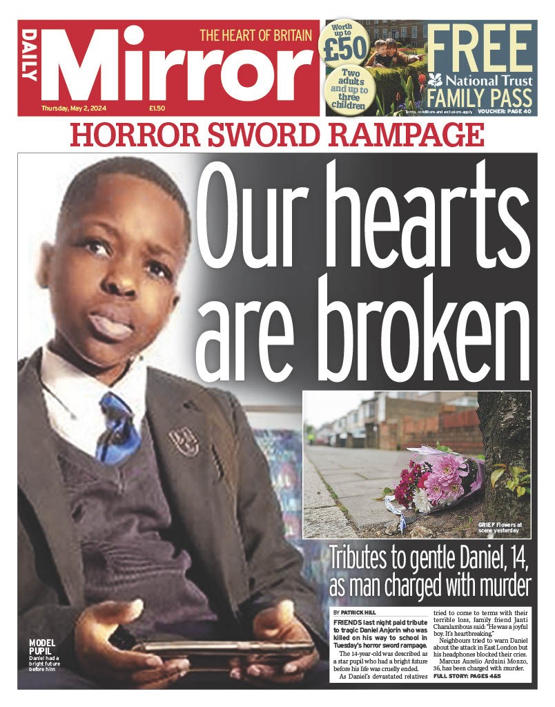 The Daily Mirror’s front page is dominated by tributes to Daniel Anjorin, a teenager slain in the Hainault sword incident.