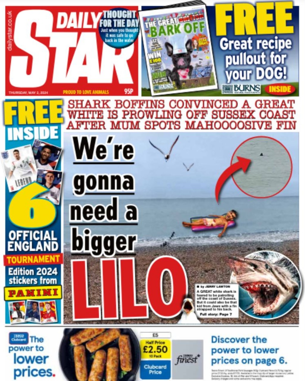 The Daily Star leads with a story on a potential great white shark sighting near the Sussex coast.
