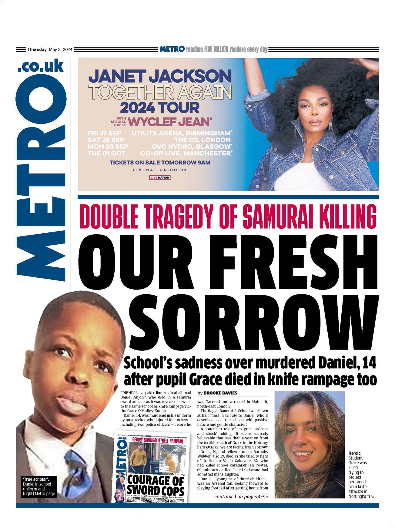 The Metro reports on the tragic death of 14-year-old Daniel Anjorin in a Hainault sword attack, who attended the same school as another attack victim, Grace O’Malley-Kumar.