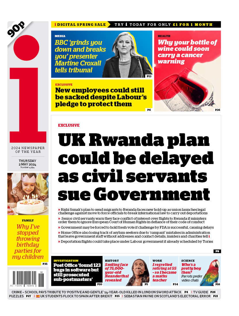 The i highlights potential hold-ups in the government’s Rwanda plan due to legal disputes.