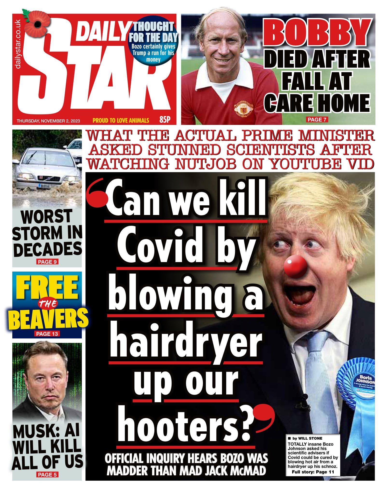 The Daily Star reports on Boris Johnson’s unusual COVID-19 solution involving a hairdryer.