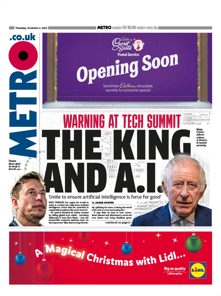 The Metro reports on the King’s call for global unity in managing the potential dangers of artificial intelligence.