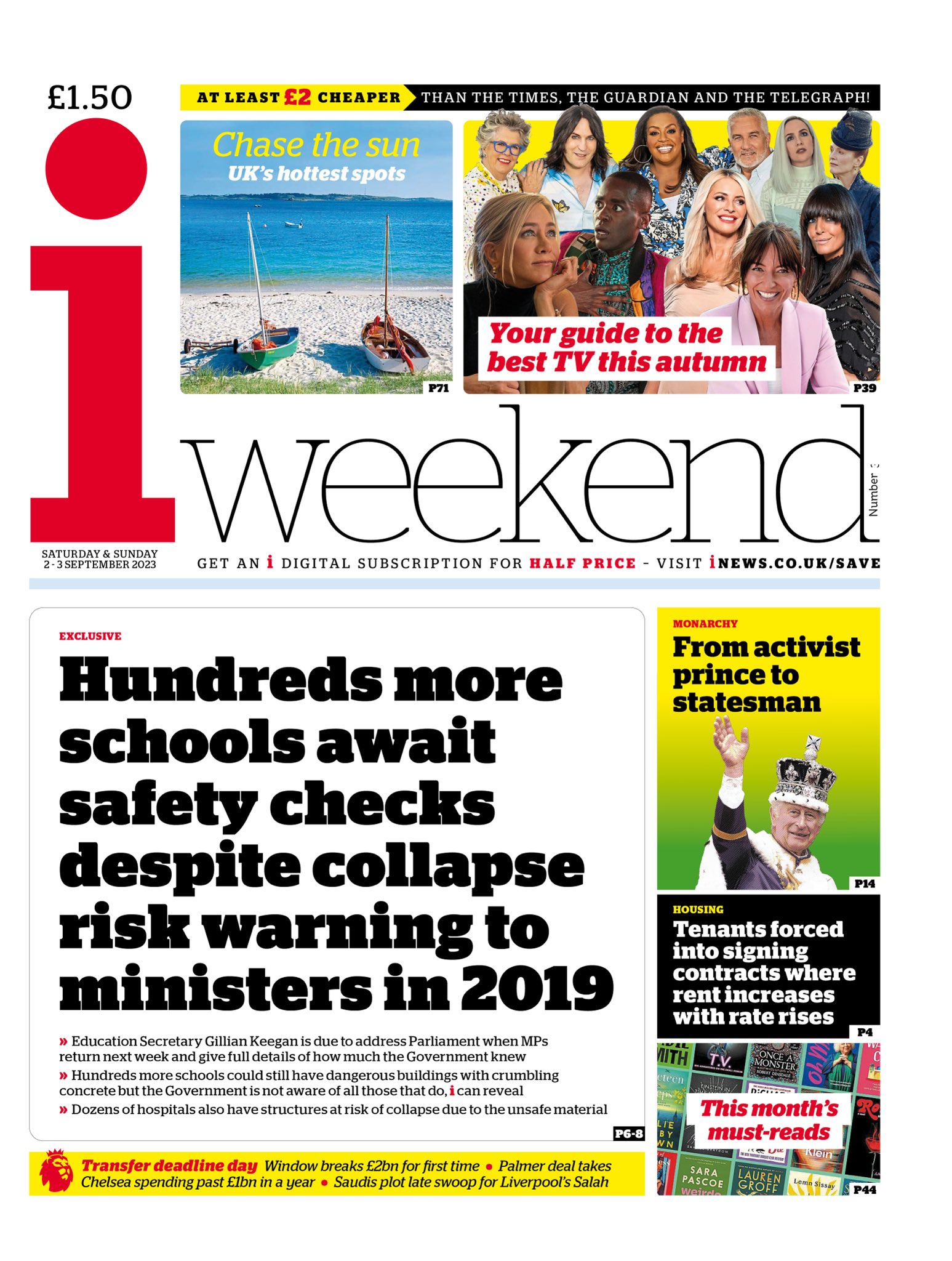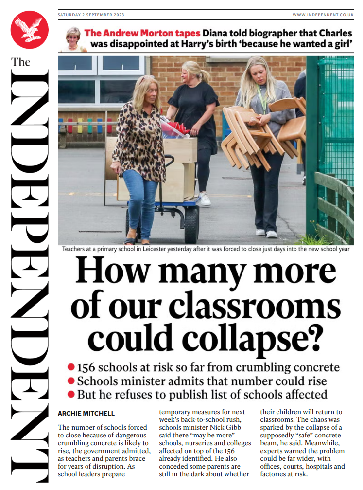 The Independent leads with concerns about the use of RAAC in school buildings in England and the government admitting that the number of school closures could rise.