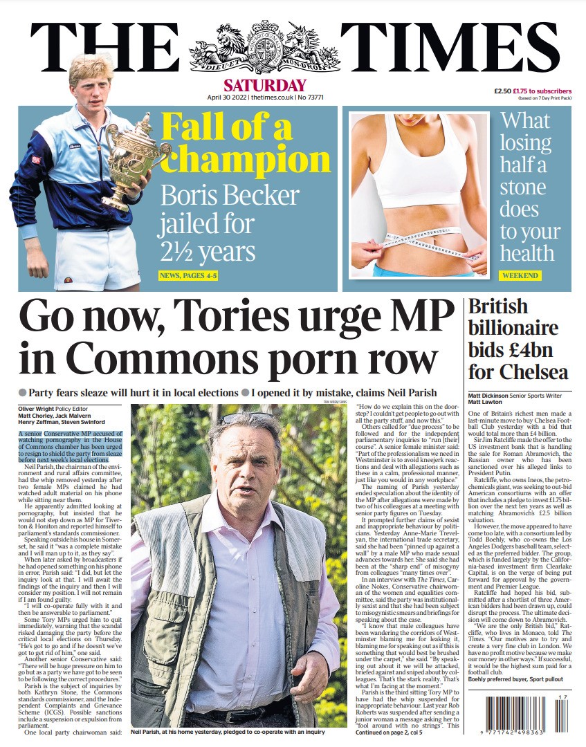 According to The Times, a senior Conservative MP is being urged to step down to protect the party from sleaze before local elections next week.