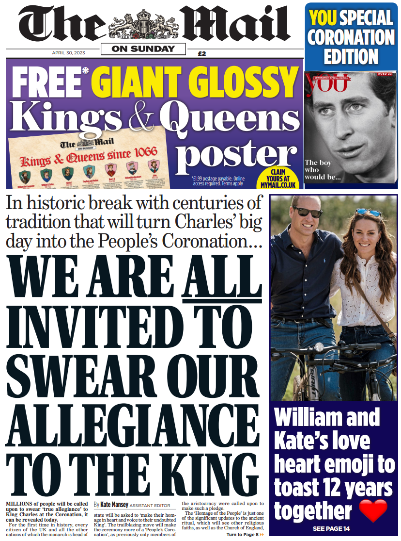 The Mail on Sunday states that everyone will be invited to pledge allegiance to the King during the coronation next weekend.