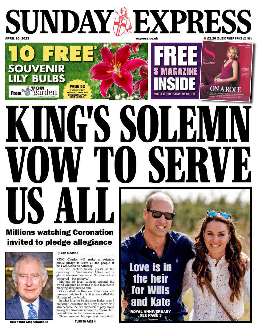 The Sunday Express claims that the King will make a “public pledge” at his coronation, vowing to serve the country instead of being served.