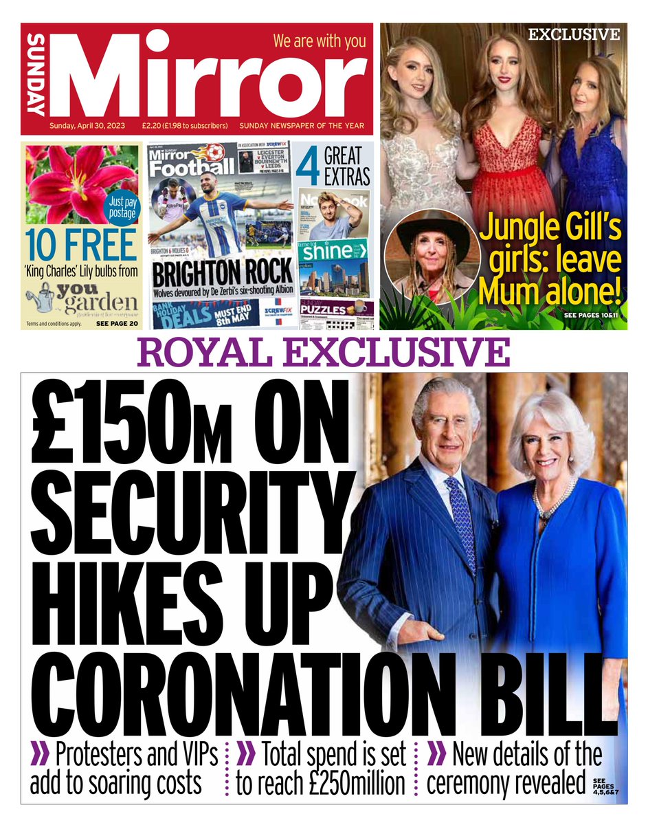 The Sunday Mirror reports that security for the upcoming coronation will cost £150m due to the large number of VIPs and protesters.