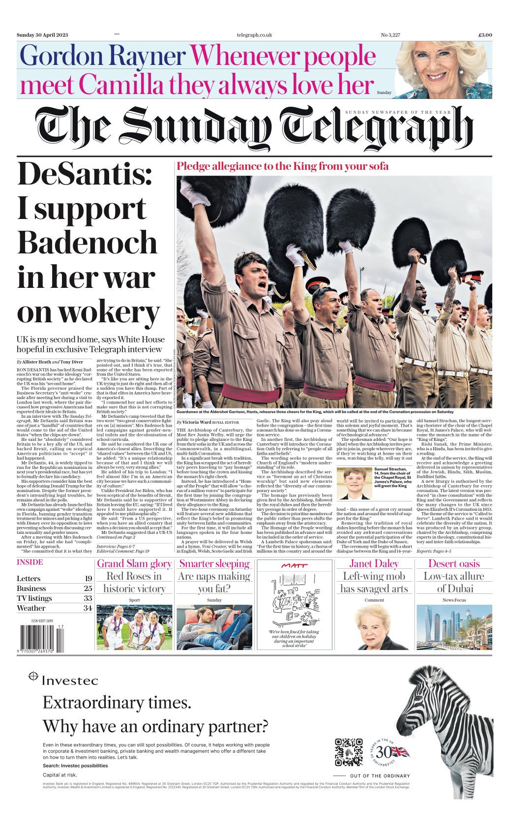 The Sunday Telegraph features an interview with Florida Governor Ron DeSantis, who supports policies laid out by Business Secretary Kemi Badenoch.
