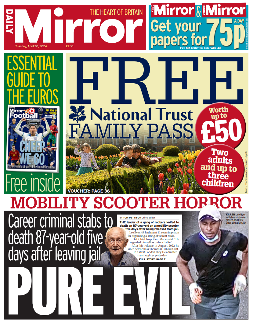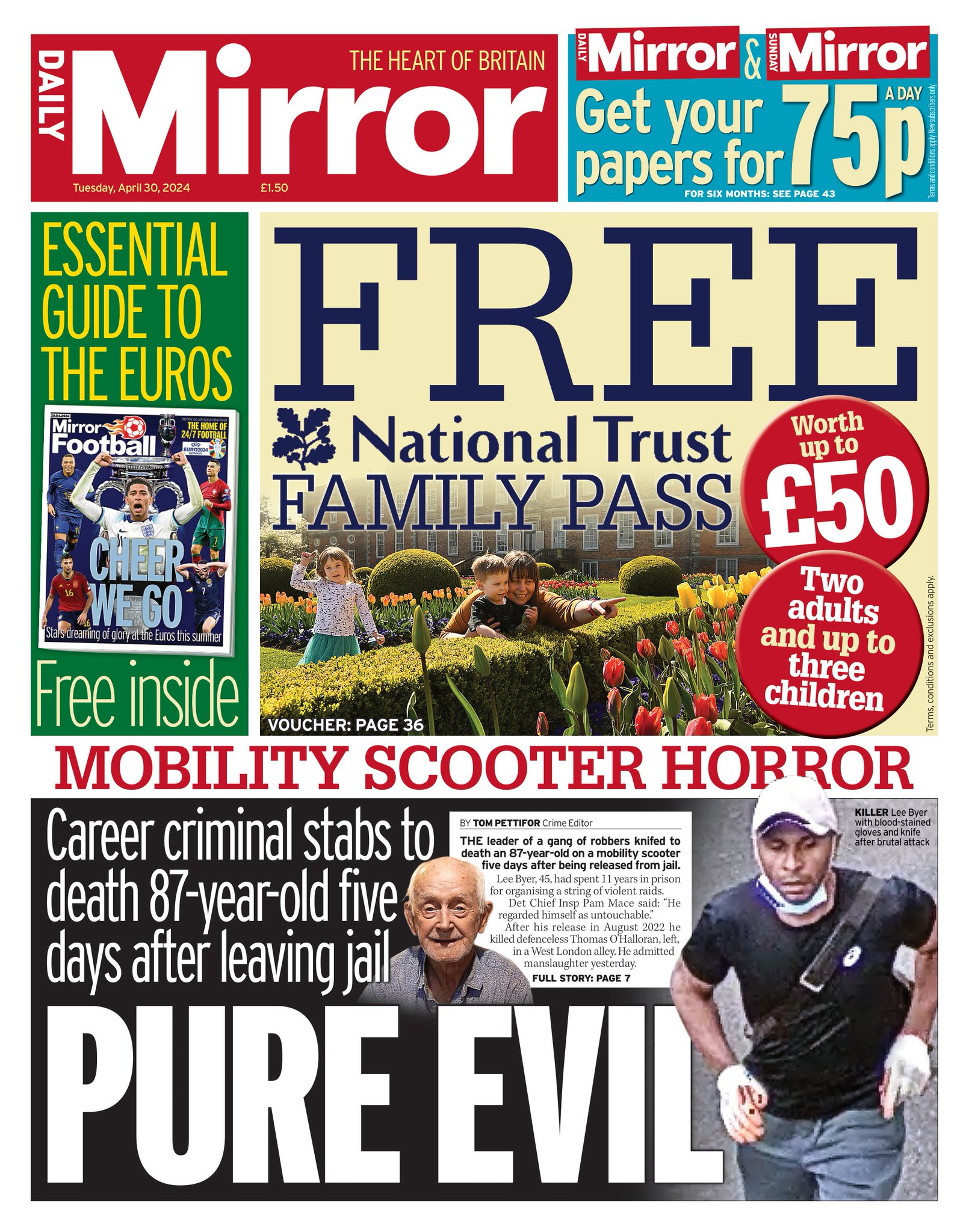 The Daily Mirror reports on the tragic murder of Thomas O’Halloran, 87, by a recently released career criminal.