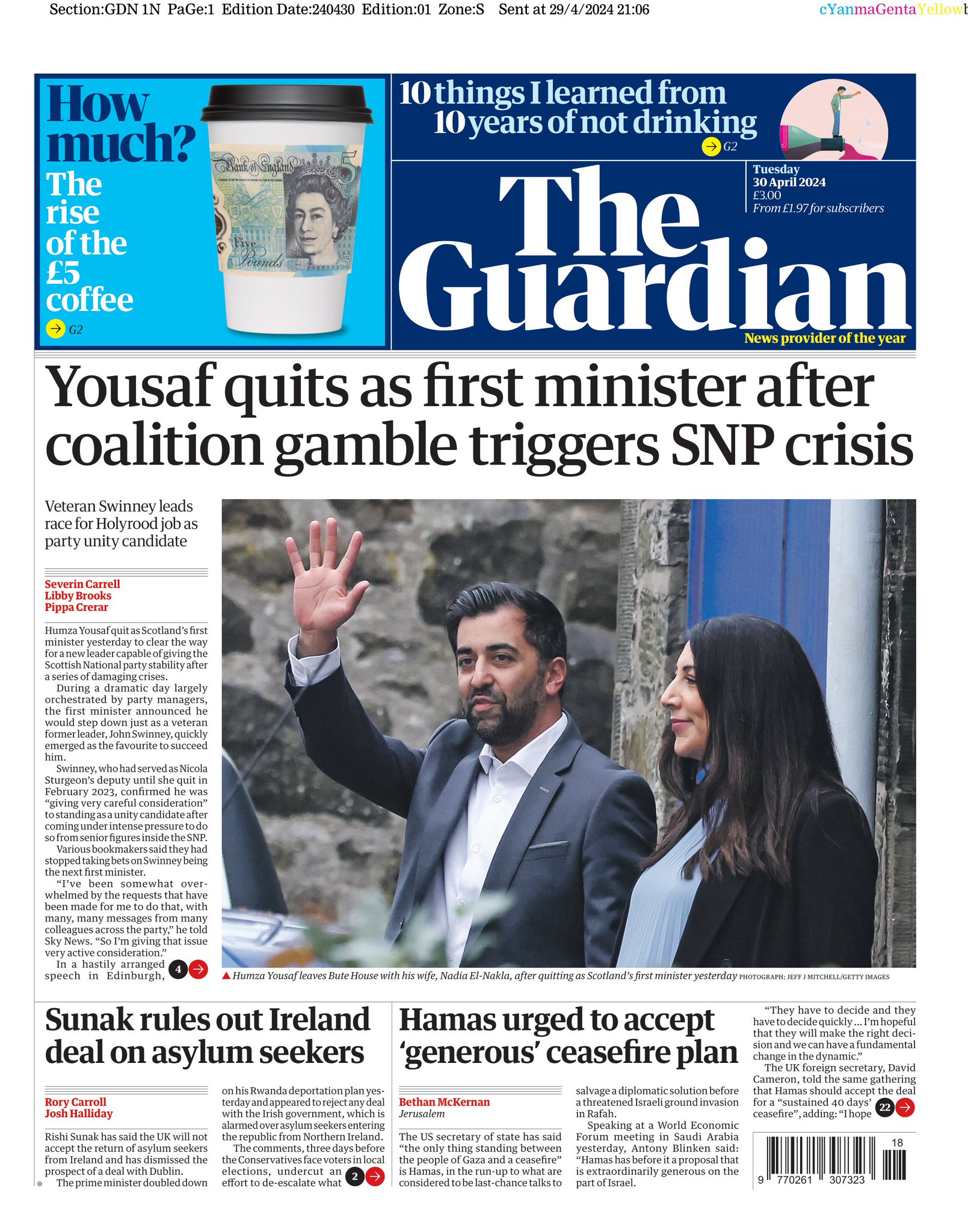 The Guardian highlights the resignation of Scottish first minister Humza Yousaf, marking another crisis for the SNP.