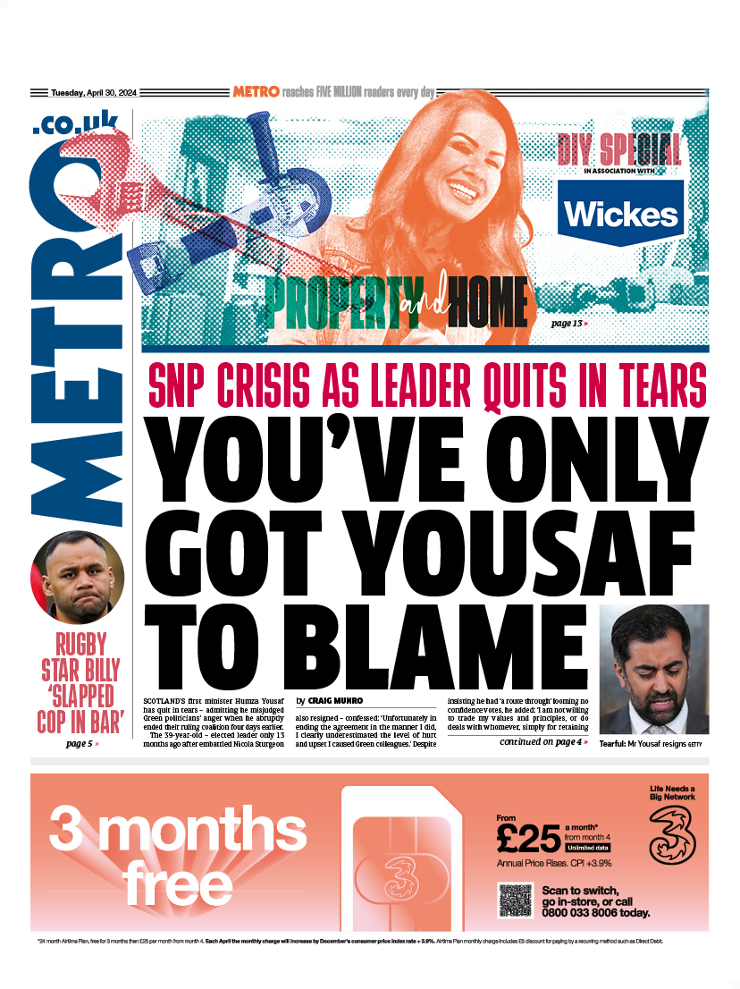 The Metro reports on the tearful resignation of Scottish First Minister Humza Yousaf.