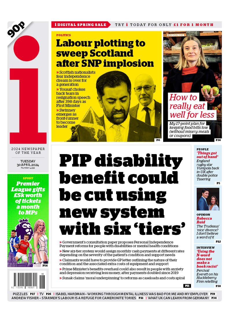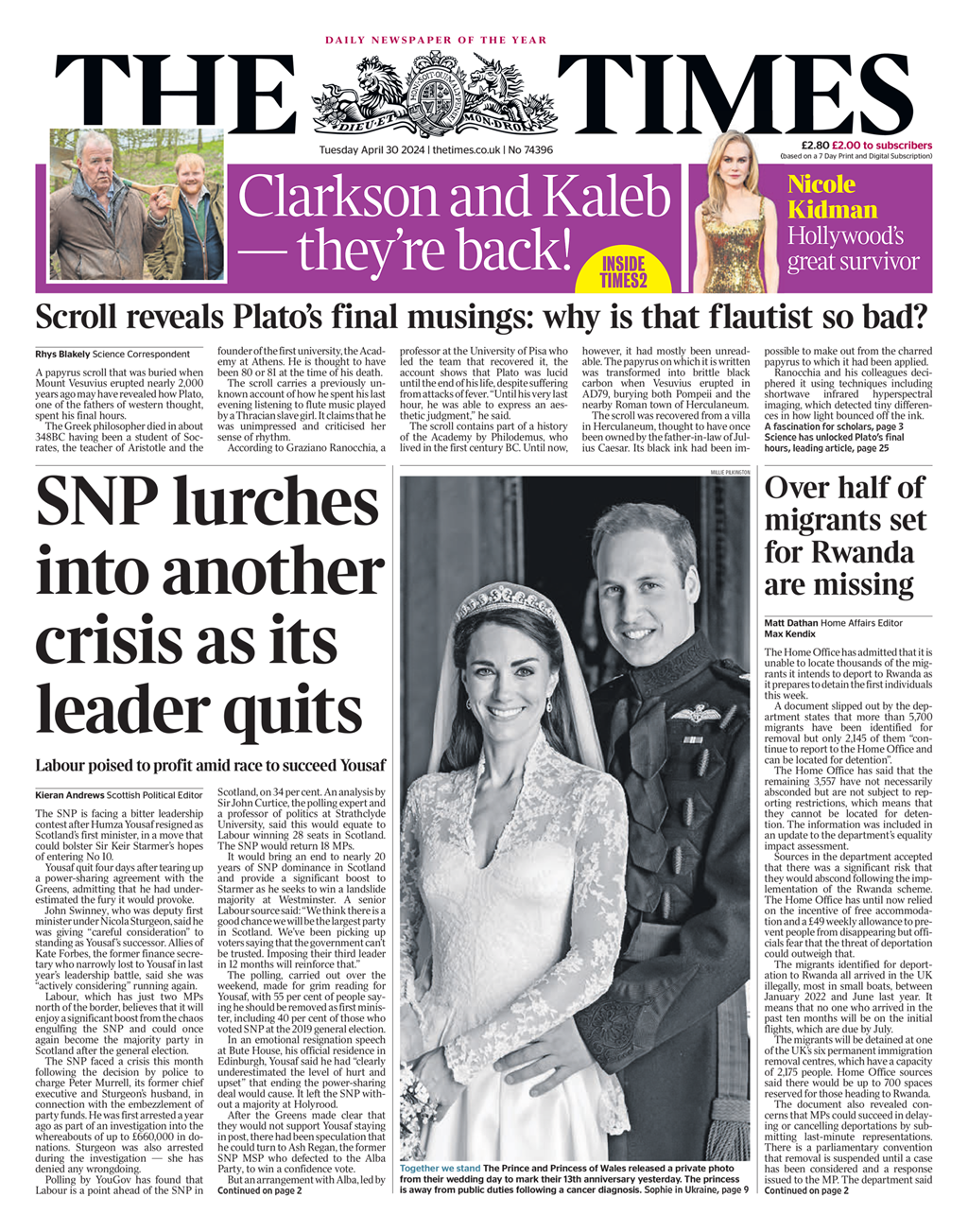 The Times forecasts a fierce leadership battle in the Scottish National Party following Humza Yousaf’s resignation, potentially aiding Labour’s bid for power.