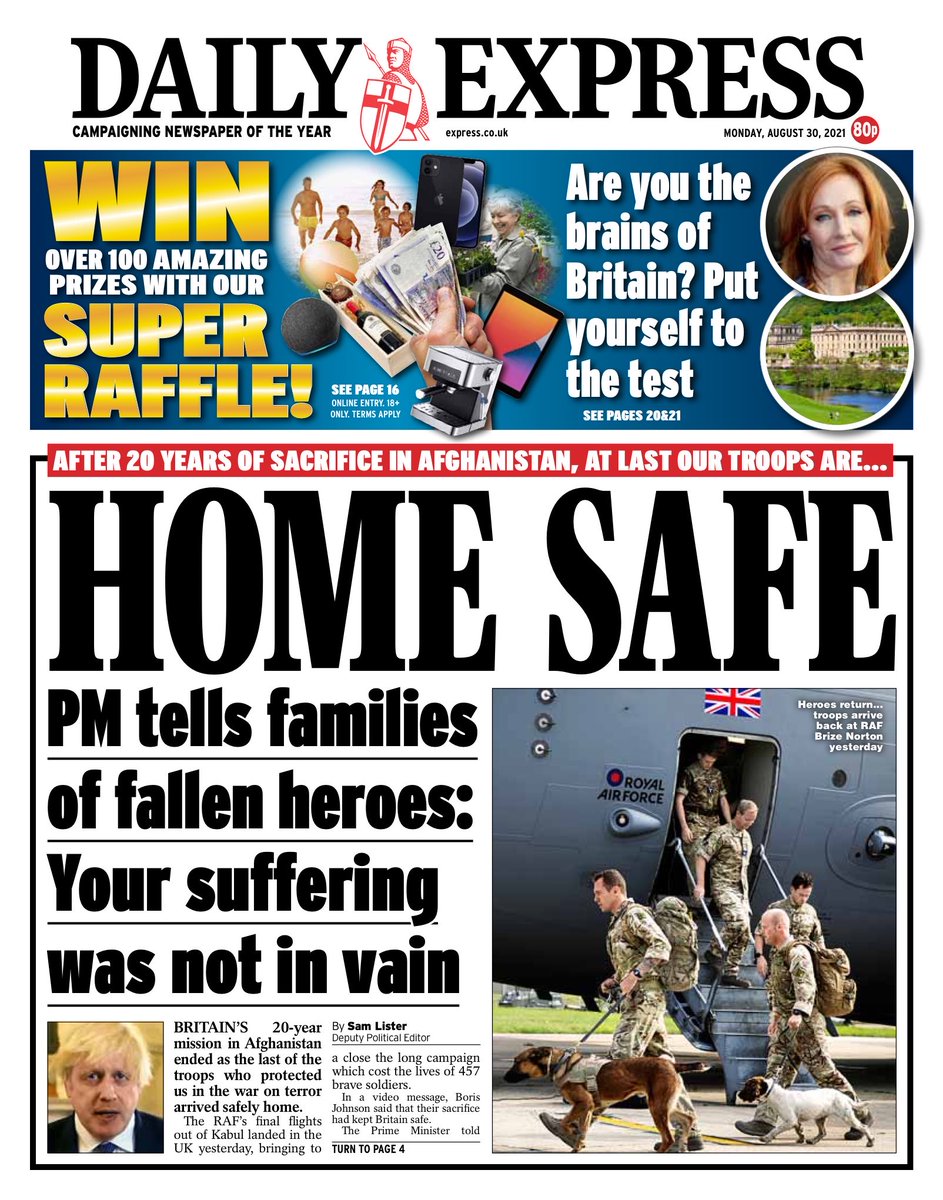 The return of UK troops to the country from Afghanistan is the top story for the Daily Express.