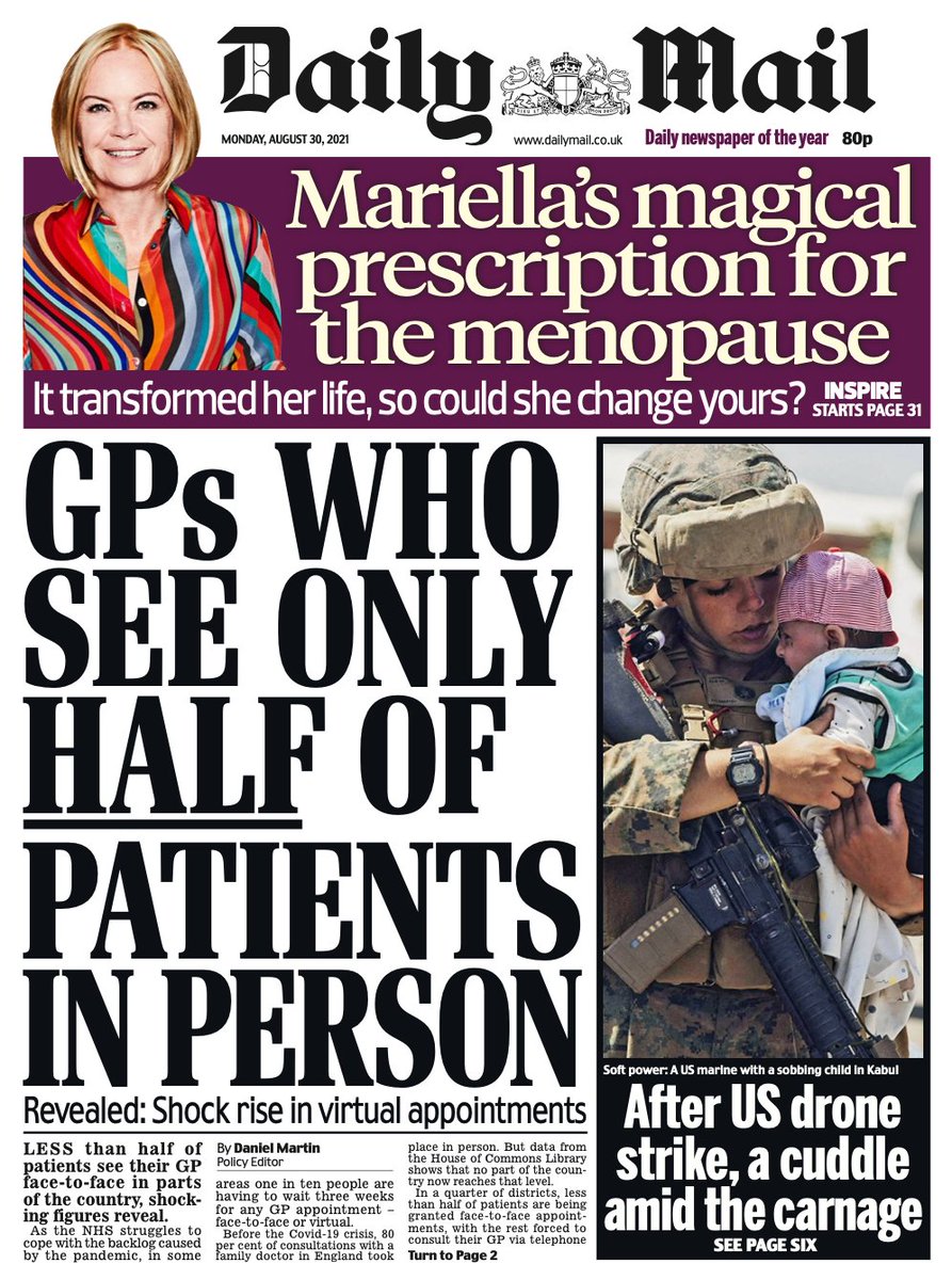The Daily Mail splashes on a story about the number of people able to see their GPs face-to-face, and the rise in virtual appointments.