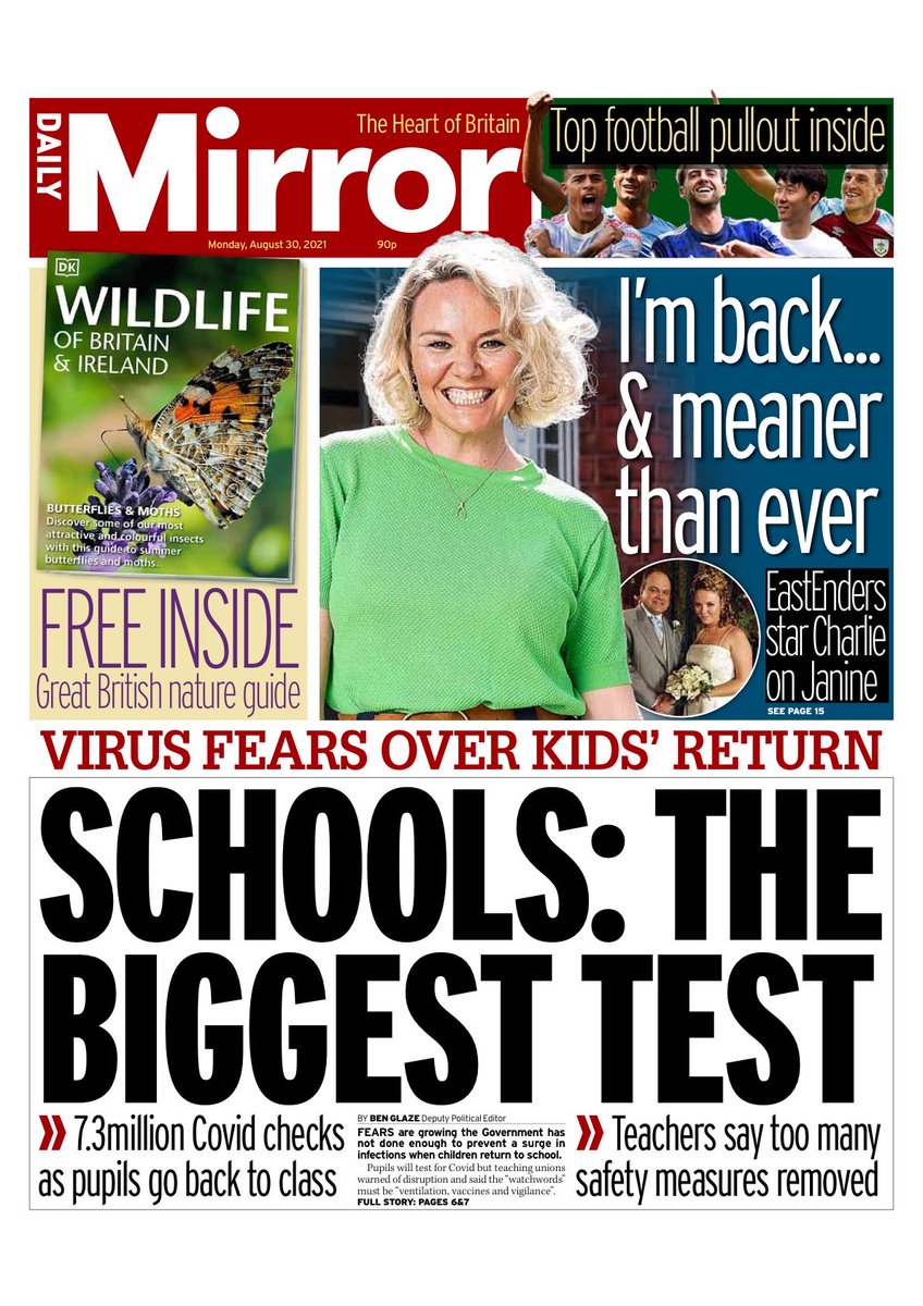 The Daily Mirror is leading with a story about the expected COVID difficulties for schools when term returns in the upcoming weeks.