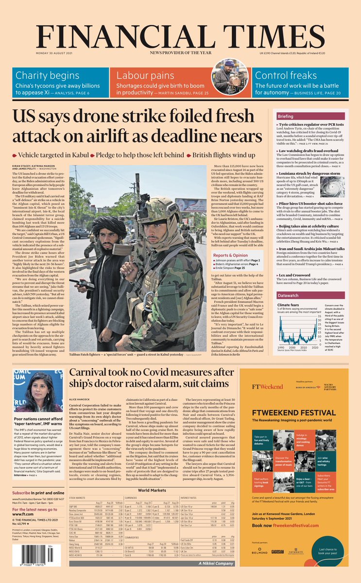 The Financial Times splashes on the story of a US drone strike foiling another attack in Kabul.