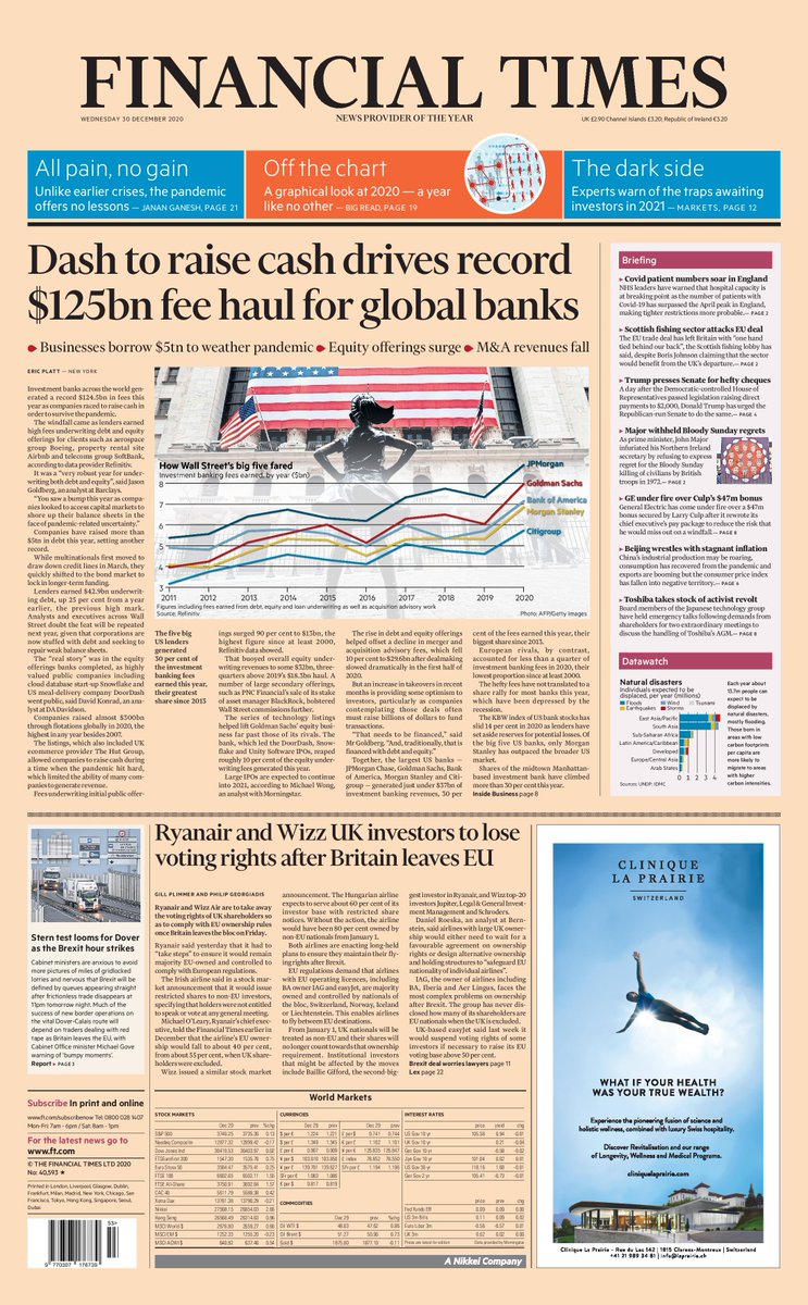 The Financial Times reports that investment banks across the world generated a record $124.5bn (£92.2bn) in fees this year as companies raced to raise money in order to survive the coronavirus pandemic.