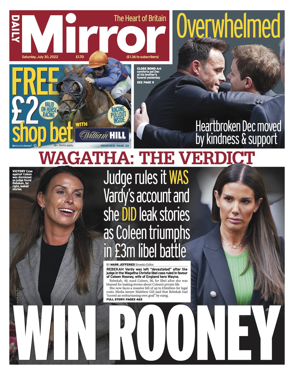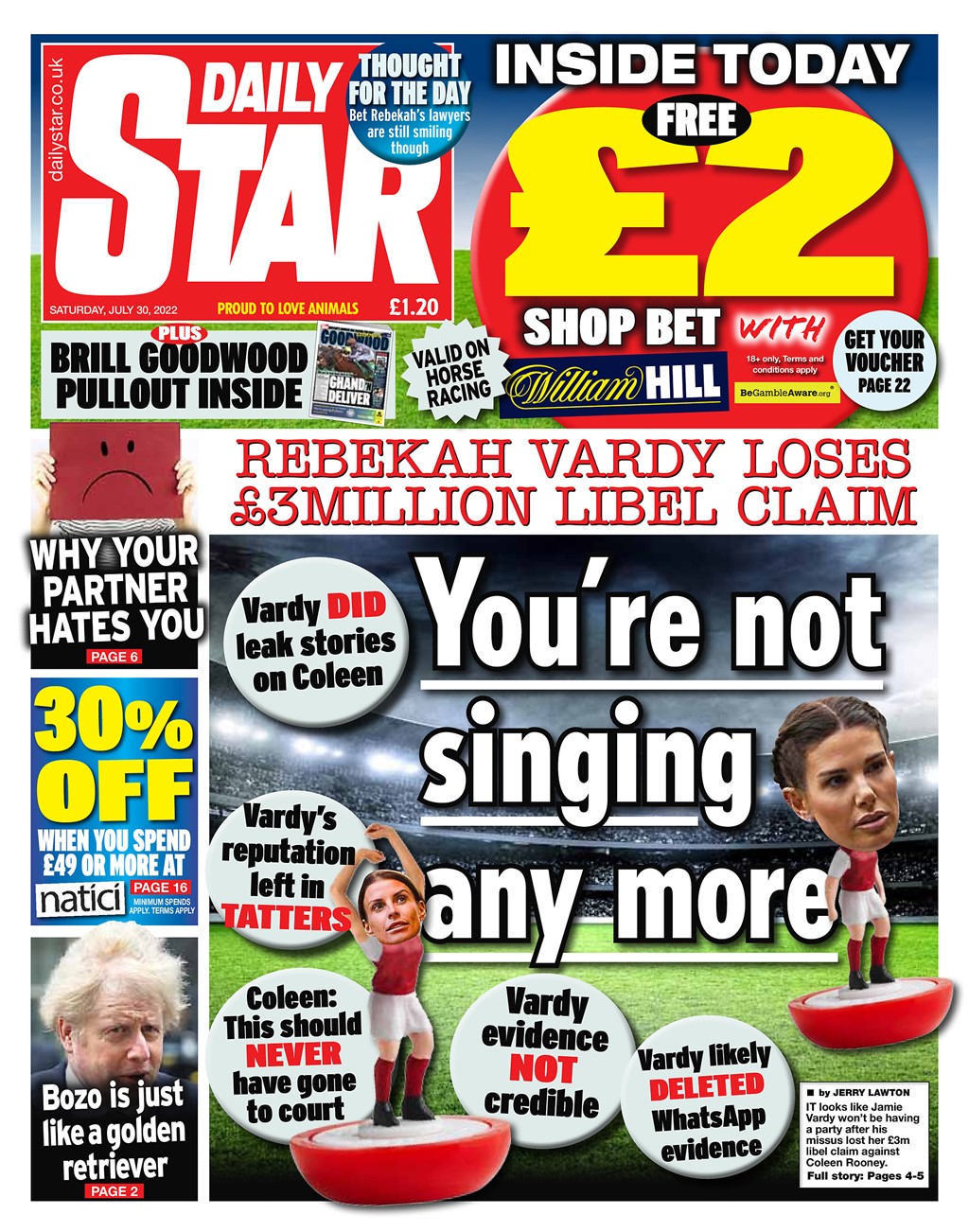 “You’re not singing any more,” reports the Daily Star as Rebekah Vardy loses her libel suit against Coleen Rooney.