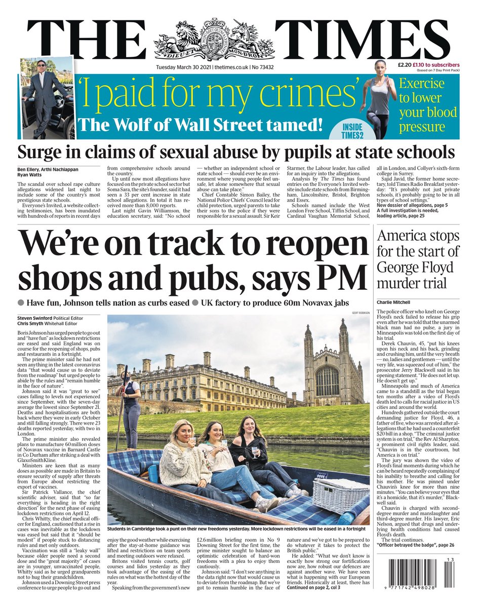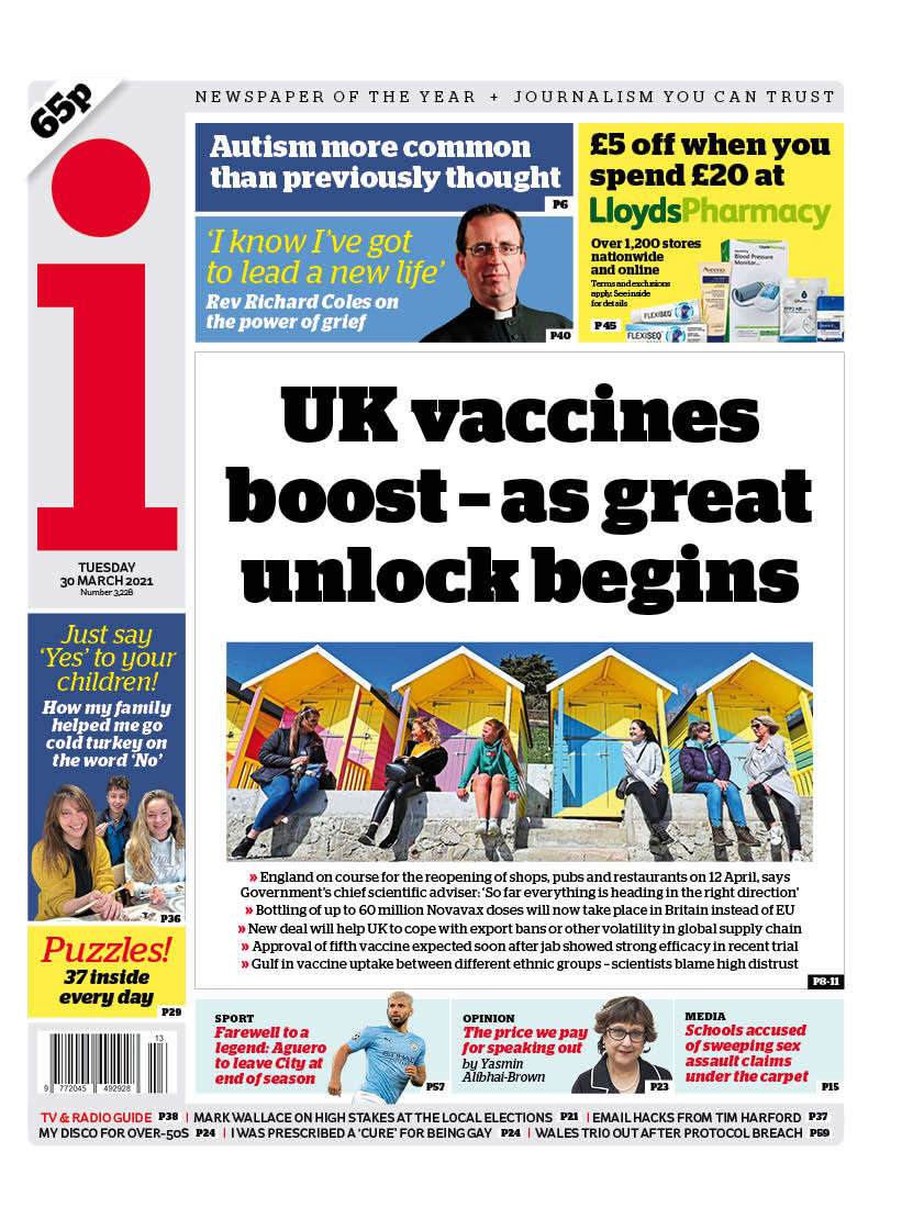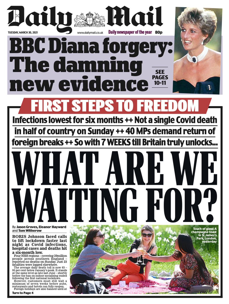 The Daily Mail says the prime minister is facing calls to lift lockdown faster as COVID-19 infections, hospital cases and deaths hit a six-month low. Four NHS regions reported no deaths on Sunday, the paper adds.