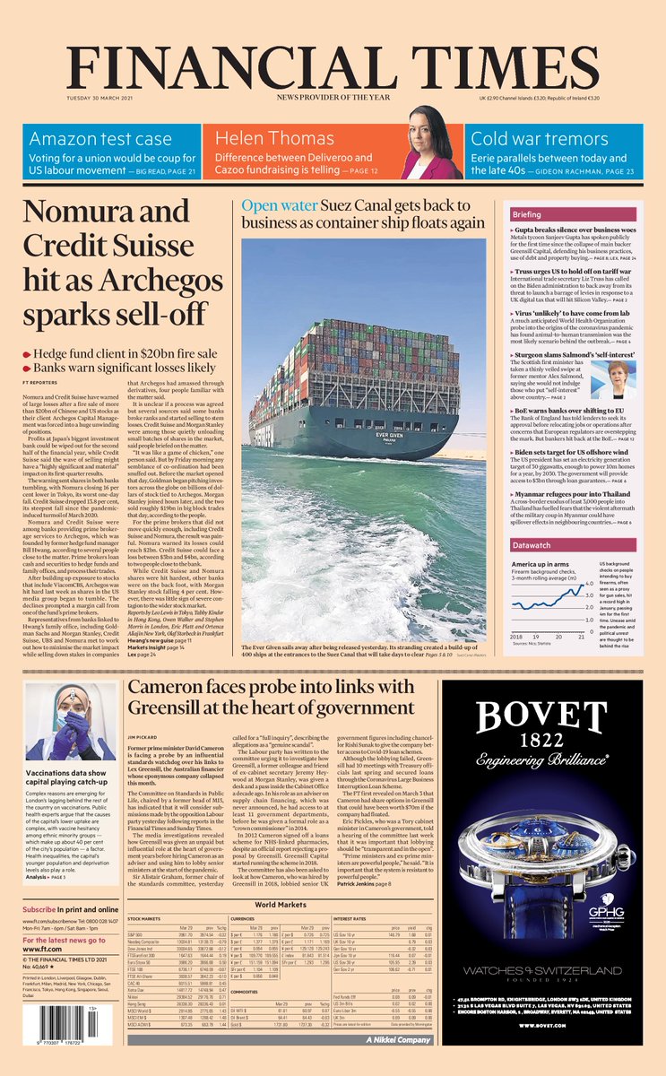 The banks Nomura and Credit Suisse have warned of large losses after a fire sale of more than $20bn (£14.5bn) of Chinese and US stocks as their client Archegos Capital Management was forced into a huge unwinding of positions, reports the Financial Times.Read more on the story here