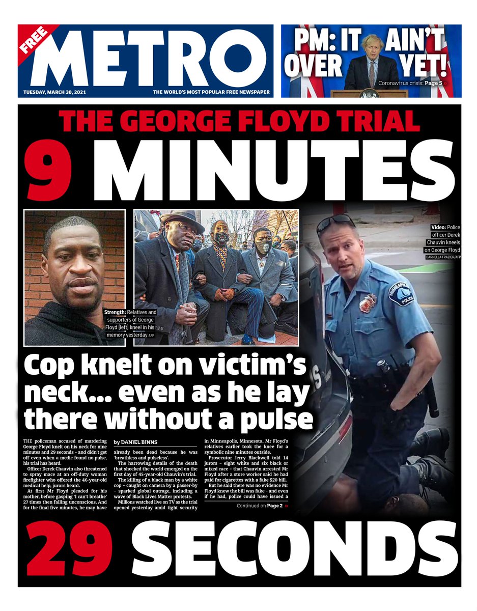 Metro says the trial of a policeman accused of murdering George Floyd has heard Derek Chauvin knelt on his neck for nine minutes and 29 seconds, and threatened to spray mace at an off-duty firefighter who offered the 46-year-old medical help.Read more on the story here