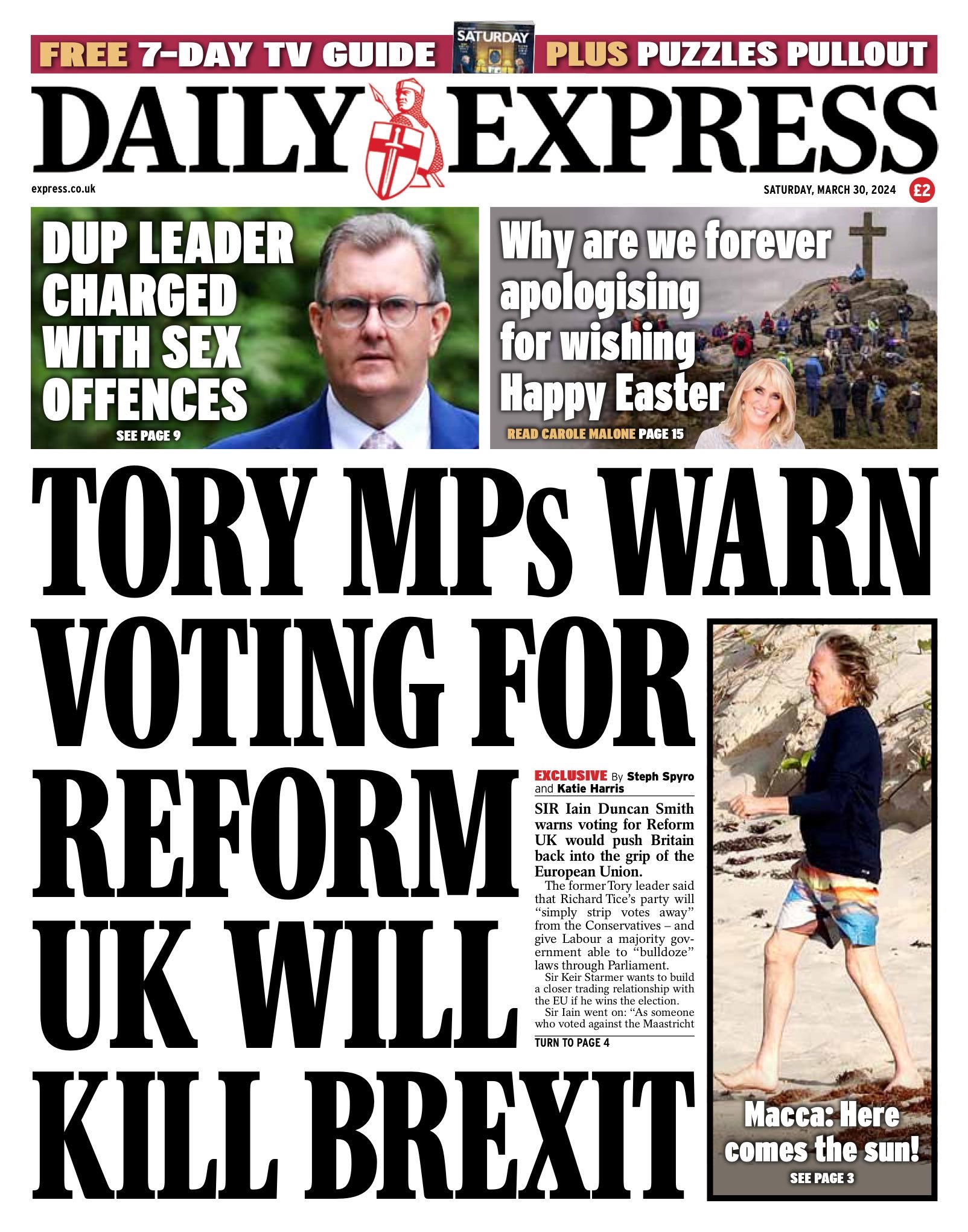 The Daily Express reports on Sir Iain Duncan Smith’s warning that voting for the Reform party could empower a Labour government.